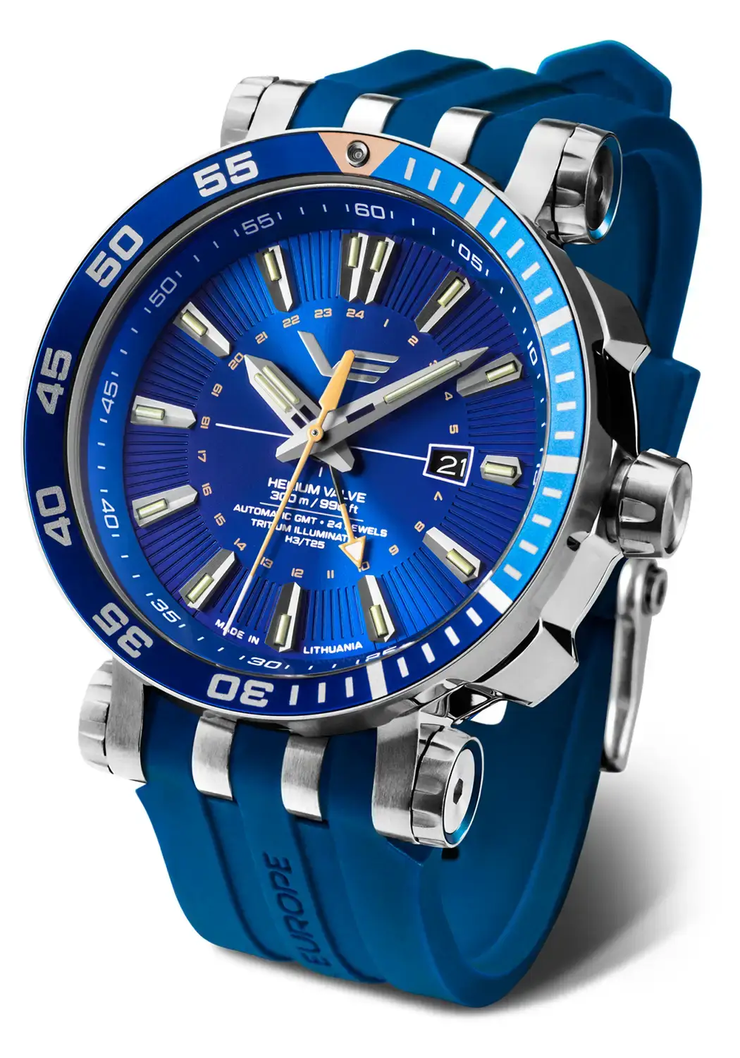 Funkce GMT umožňuje sledovat čas ve dvou různých časových pásmech současně, což je ideální pro cestovatele. Hodinky s druhým časovým pásmem jsou rovněž vybaveny funkcí stop sekundy, která zastaví sekundovou ručičku po vytažení korunky, což umožňuje přesné nastavení času, a rychlou korekcí data, která umožňuje snadnou změnu data bez nutnosti dlouhého otáčení ručičkami. Energia Rocket Automatic GMT má šroubovací korunku, 18 švýcarských tritiových trubic (samostatné osvětlení s konstantní intenzitou po dobu 10 let, celková životnost až 25 let) a další silikonový řemínek, který lze snadno vyměnit pomocí přiloženého šroubováku. Hodinky s tritiovým osvětlením jsou profesionálně zabaleny v originálním vodotěsném pouzdře ve tvaru potápěčského kufříku, který obsahuje další silikonový řemínek a nástroj na jeho výměnu. Kufřík lze snadno přeměnit na sběratelské pouzdro, které pojme 4 hodinky, 4 náhradní řemínky a jeden šroubovák. Rozměry hodinek s heliovým ventilem jsou 48 mm x 17,3 mm, což jim dodává výrazný vzhled.