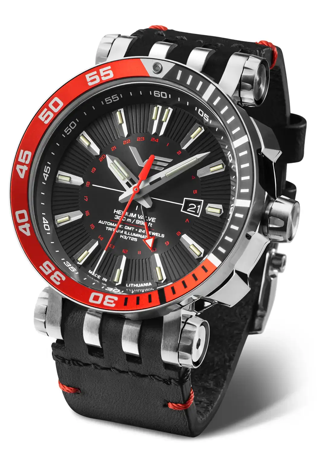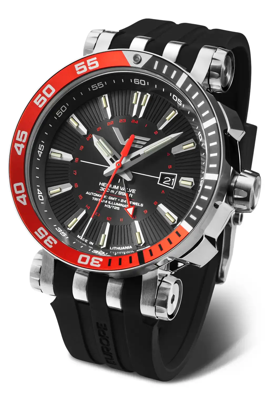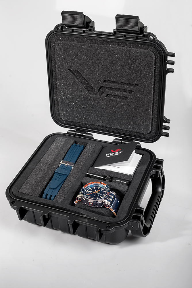 Funkce GMT umožňuje sledování času ve dvou různých časových pásmech současně, což je ideální pro cestovatele. Chronometr s dvojím časem je také vybaven funkcí stop sekundy, která zastavuje sekundovou ručičku po vytáhnutí korunky, což umožňuje přesné nastavení času, a rychlou korekcí data, která umožňuje snadnou změnu data bez dlouhého otáčení ručičkami. Vostok Europe NH34-575A717 má šroubovací korunku, 18 švýcarských tritiových trubiček (samosvítící světlo s konstantní intenzitou po dobu 10 let, celková životnost až 20 let) a další silikonový řemínek, který lze snadno vyměnit pomocí přiloženého šroubováku. Celé je profesionálně zabalené v originálním, vodotěsném boxu ve tvaru potápěčské truhly, který obsahuje další silikonový řemínek a nástroj na jeho výměnu. Box lze snadno přeměnit na sběratelské pouzdro, které pojme 4 hodinky, 4 další řemínky a jeden šroubovák. Rozměry hodinek s heliovým ventilem jsou 48 mm x 17,3 mm, což jim dodává výrazný vzhled.