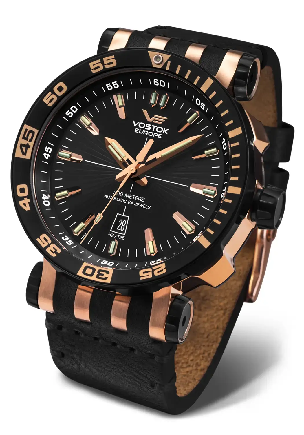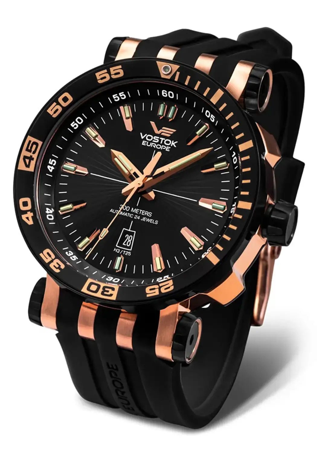 Tyto černo-zlaté pánské hodinky z kolekce Energia Rocket nabízejí vodotěsnost až 300 metrů/30 ATM/30 bar a masivní 48mm pouzdro z ušlechtilé oceli 316L, pokryté černou a růžově zlatou povrchovou úpravou PVD. Poháněny jsou přesným automatickým strojkem TMI NH35A a jejich funkčnost zvyšuje heliový ventil, který chrání hodinky před změnami tlaku, což je klíčové pro potápěče. Dále mají jednosměrně otočnou lunetu s 60minutovou stupnicí, usnadňující měření času pod vodou. Zesílené minerální sklo K1 s antireflexní vrstvou (tloušťka 3,5 mm) spolehlivě chrání ciferník a zajišťuje odolnost proti poškrábání a nárazům. Zadní část pouzdra obsahuje průhledné dýnko, odhalující precizní chod japonského mechanizmu.