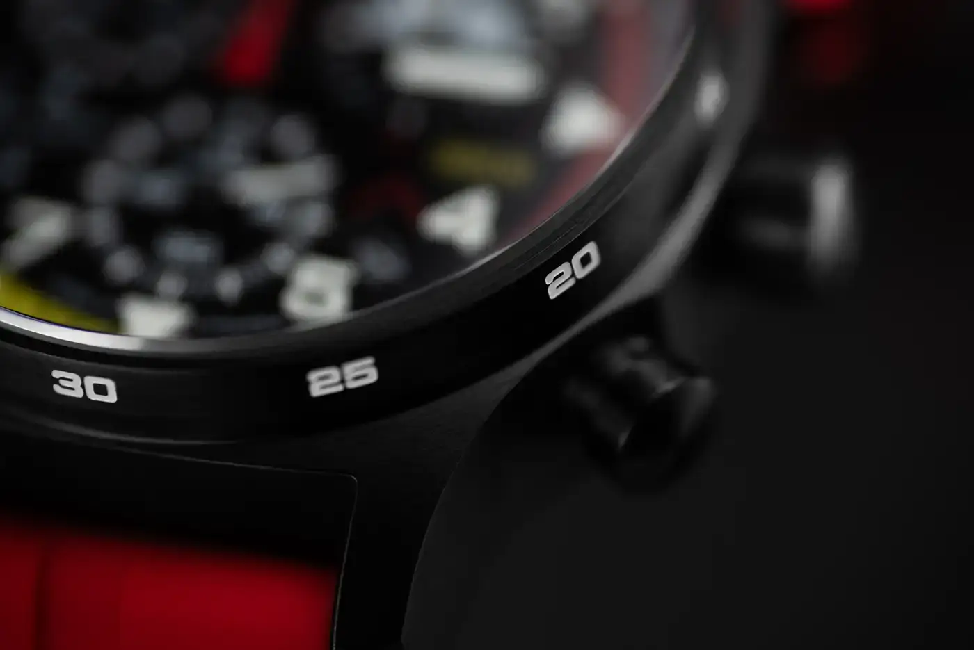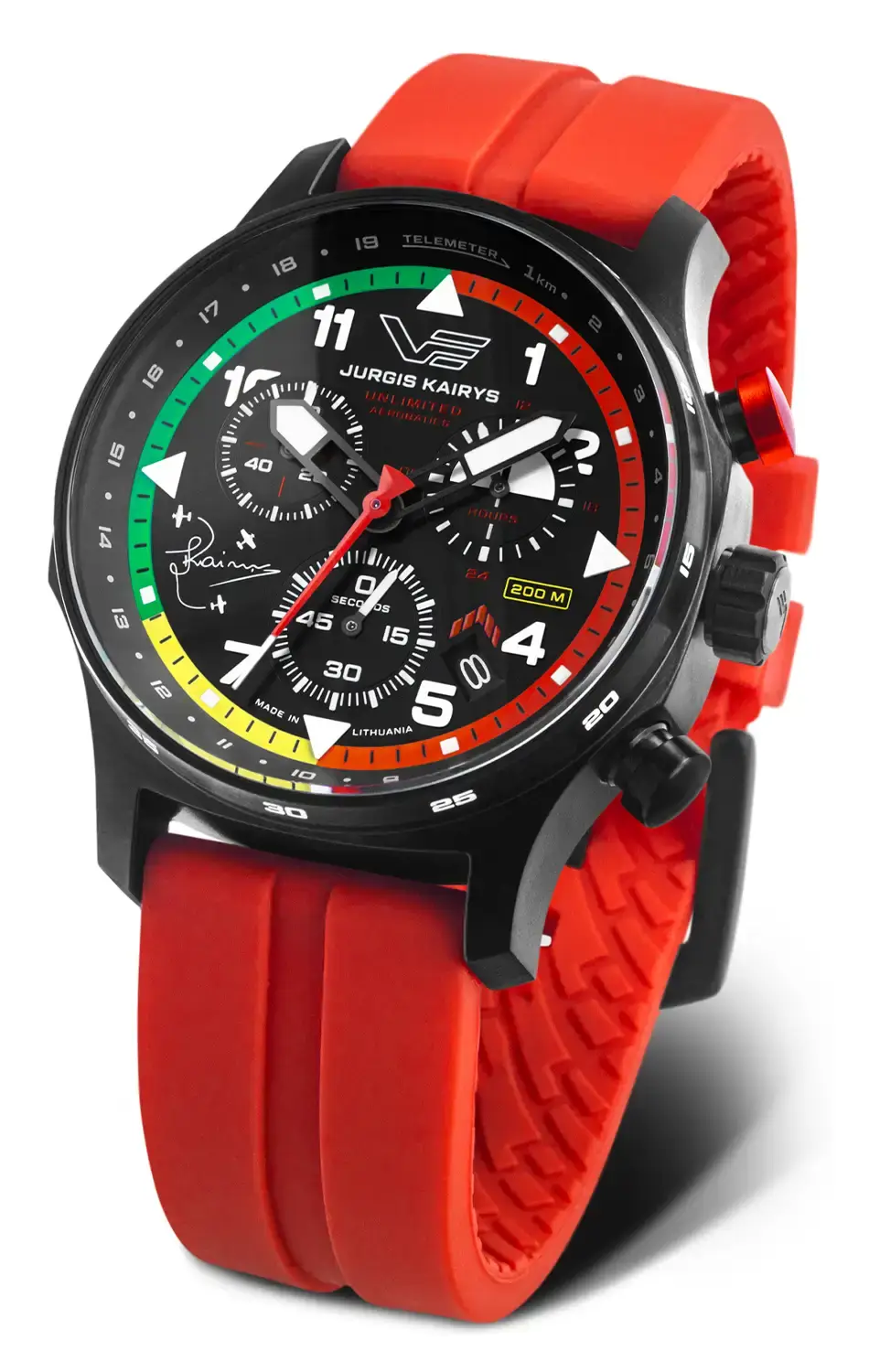 Ocelové pouzdro o průměru 43 mm je vyrobeno z ušlechtilé oceli 316L a pokryté černou vrstvou PVD, což dodává hodinkám Vostok Europe VK68-592C775 rozhodný a moderní charakter. Černý matný číselník doplněný o ukazatele chronografu, indexy s podsvícením Super-LumiNova a telemetrickou stupnici zaručuje vynikající čitelnost za každých podmínek. Barevný kroužek v barvách litevské vlajky plní dvojí úlohu – estetickou i funkční – a pomáhá pilotům rychle určit vzdálenost od bouřky pomocí telemetrické stupnice. Celkový dojem doplňuje výrazný červený silikonový řemínek, jehož energie symbolizuje dynamiku letecké akrobacie.