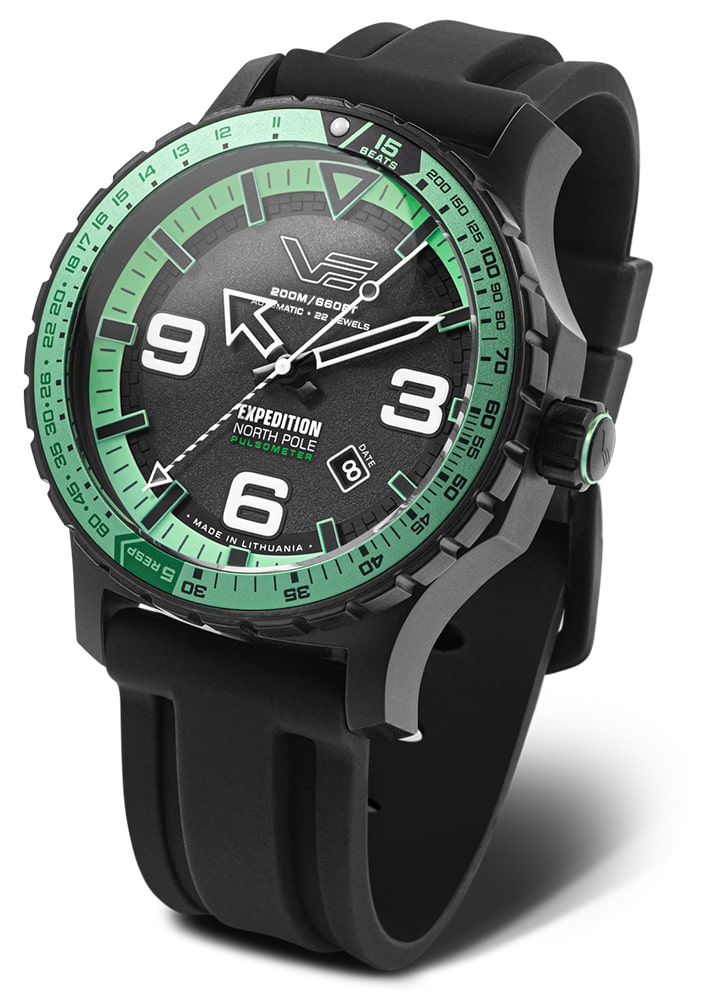 Hlavní funkcí modelu Vostok Europe Expedition North Pole Polar Night je vestavěný pulsometr, umožňující monitorování srdeční frekvence a frekvence dýchání bez nutnosti použití dalších zařízení. Otočná pulsometrická a dechová luneta v barvě noční zeleně umožňuje rychlé a přesné měření přibližné srdeční frekvence (počet tepů za minutu) a frekvence dýchání (počet dechů za minutu), což činí hodinky VE s pulsoměrem neocenitelným nástrojem v extrémních situacích. Kromě toho, tyto velké vintage hodinky jsou vybaveny dalším řemínkem z černého silikonu s rychloupínacími pružinami, což umožňuje snadnou personalizaci.