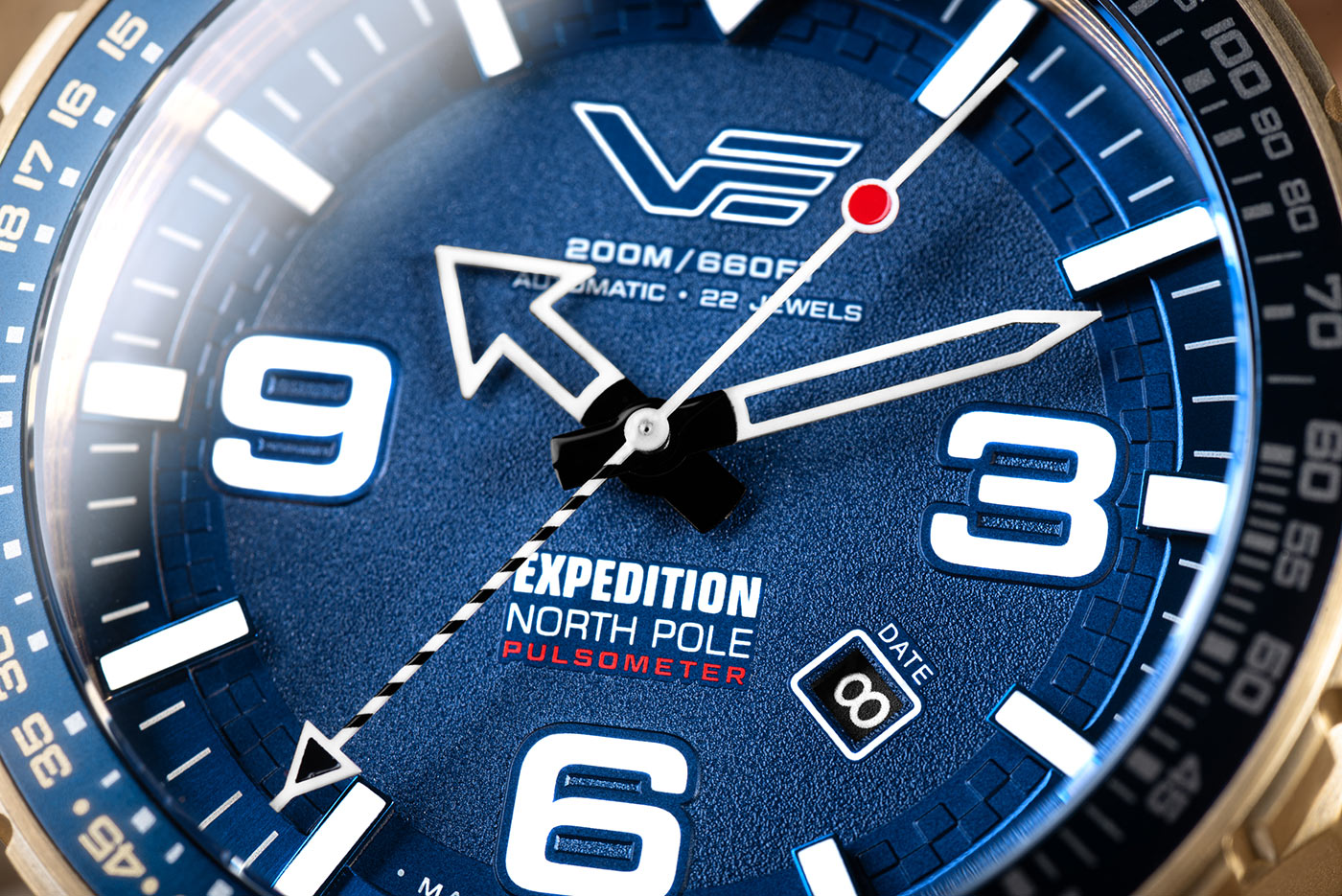 Hlavní funkcí modelu Vostok Europe Expedition North Pole Polar Sun je vestavěný pulzometr, umožňující monitorování tepové frekvence a četnosti dýchání bez potřeby dalších zařízení. Otočný pulzometrický a dýchací rámeček ve dvou směrech umožňuje rychlé a přesné měření přibližné tepové frekvence (počtu úderů za minutu) a četnosti dýchání (počtu nádechů za minutu), což činí hodinky VE s pulzometrem neocenitelným nástrojem v extrémních situacích. Kromě toho je tento velký vintage hodinky vybaven dodatečným řemínkem z modrého silikonu s rychloupínacími pružinovými mechanismy, což umožňuje snadnou personalizaci.