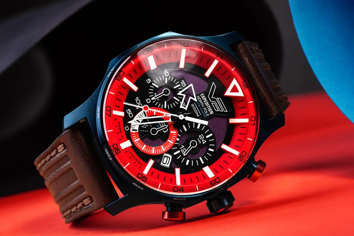 Limitované pánské hodinky Vostok Europe Expedition North Pole Polar Sunrise VR42-595D734 jsou skutečnou definicí výrazného stylu a funkčnosti. Jejich robustní ocelové pouzdro v hluboké modré barvě s červenými akcenty a dodatečnou minutovou stupnicí upoutá pozornost a vyniká na pozadí drsné bílé arktické krajiny. Matná úprava pouzdra, obohacená o kartáčovaný povrch, jim dodává moderní sportovní vzhled, který zároveň odráží odolnost a spolehlivost v extrémních podmínkách. Ciferník je mistrovským technologickým dílem – vícevrstvá, poloprůhledná, skeletová konstrukce spojuje výrazné barvy s praktickou funkčností. Ciferník je vybaven luminiscenčními indexy a prořezávanými ručičkami pokrytými vrstvou Super-Luminova, což zaručuje skvělou čitelnost za všech podmínek. Chrání jej sklo K1 o tloušťce 4,1 mm s antireflexní vrstvou, což zajišťuje vynikající výkon při dobrodružstvích bez ohledu na intenzitu světla.