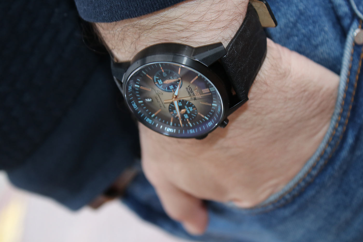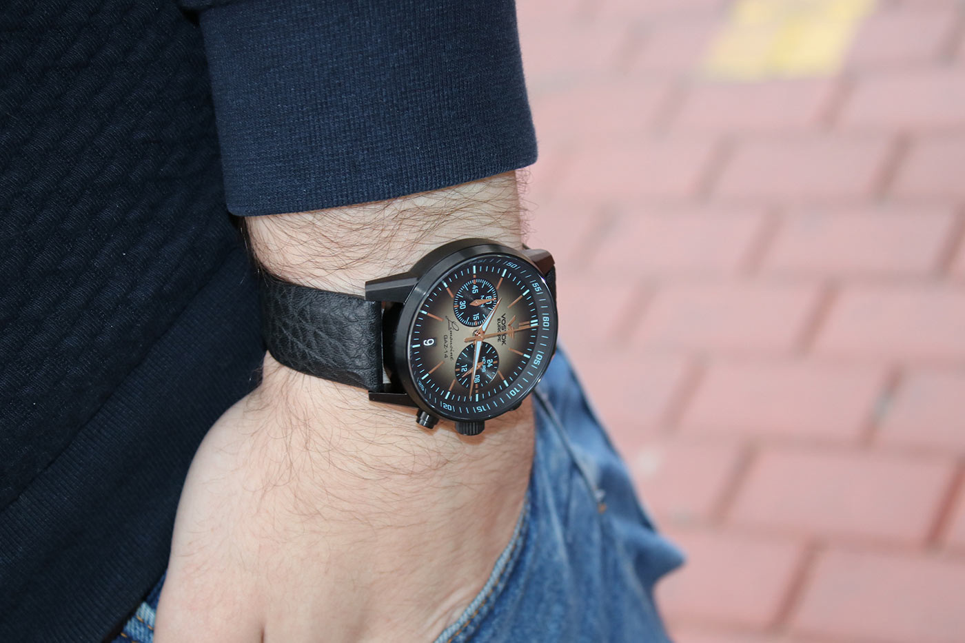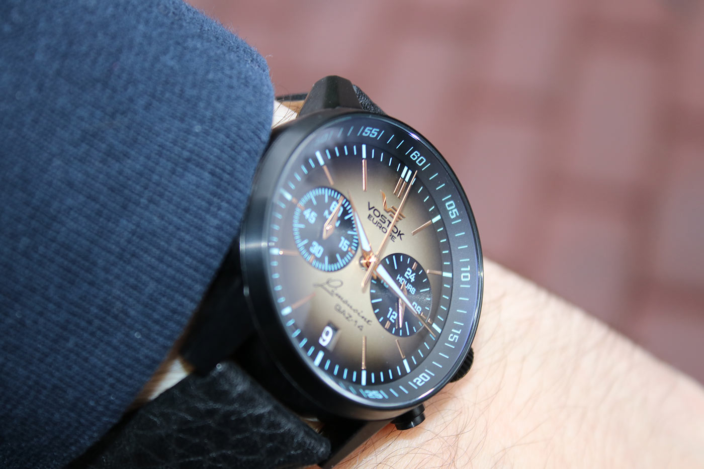 Hodinky s chronografem a 24hodinovým číselníkem Vostok Europe VK64-560C691 jsou umístěny v kulatém, kartáčovaném pouzdře o průměru 43 mm, vyrobeném z odolné nerezové oceli potažené PVD povlakem v černé barvě. Jeho stínovaný, zahloubený ciferník je jemně rozdělen na funkční segmenty. Vynikají na něm aplikované, pozlacené ručičky naplněné Super-LumiNovou, zlepšující čitelnost ve tmě, a dva tmavé subčíselníky chronografu a 24hodinového času. Plynoucí sekundová ručička, nesvítící, přechází přes hodinové značky se zlatými lineárními indexy. Hodinky obsahují dvě minutové stupnice - jednu těsně nad hodinovými značkami, druhou na vyvýšeném okraji ciferníku. Ochranu zajišťuje tvrzené minerální sklo K1 odolné proti poškrábání a nárazům.