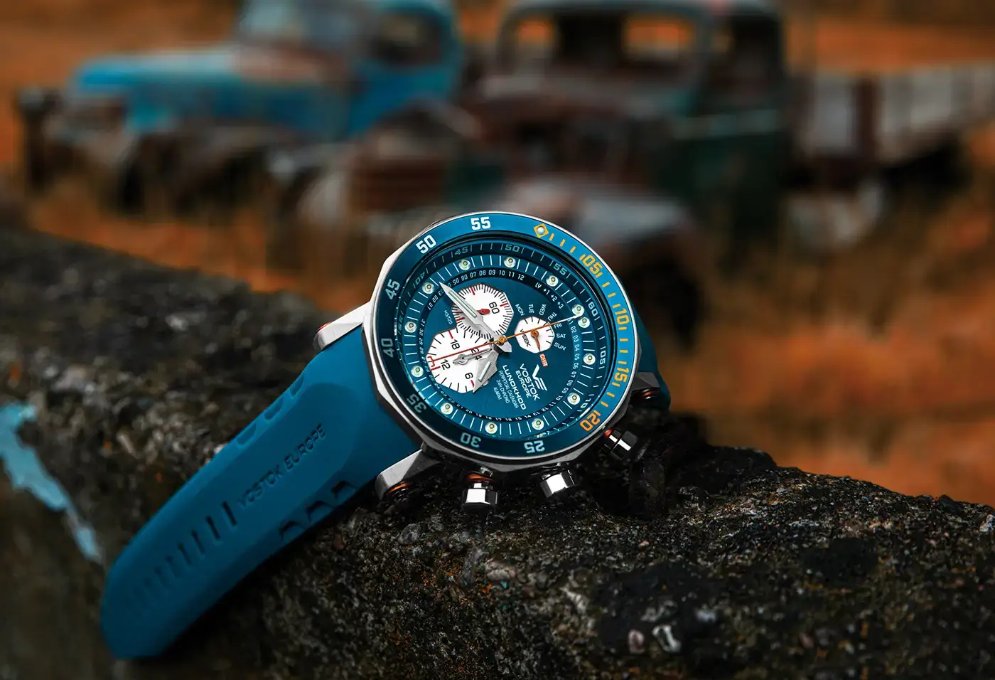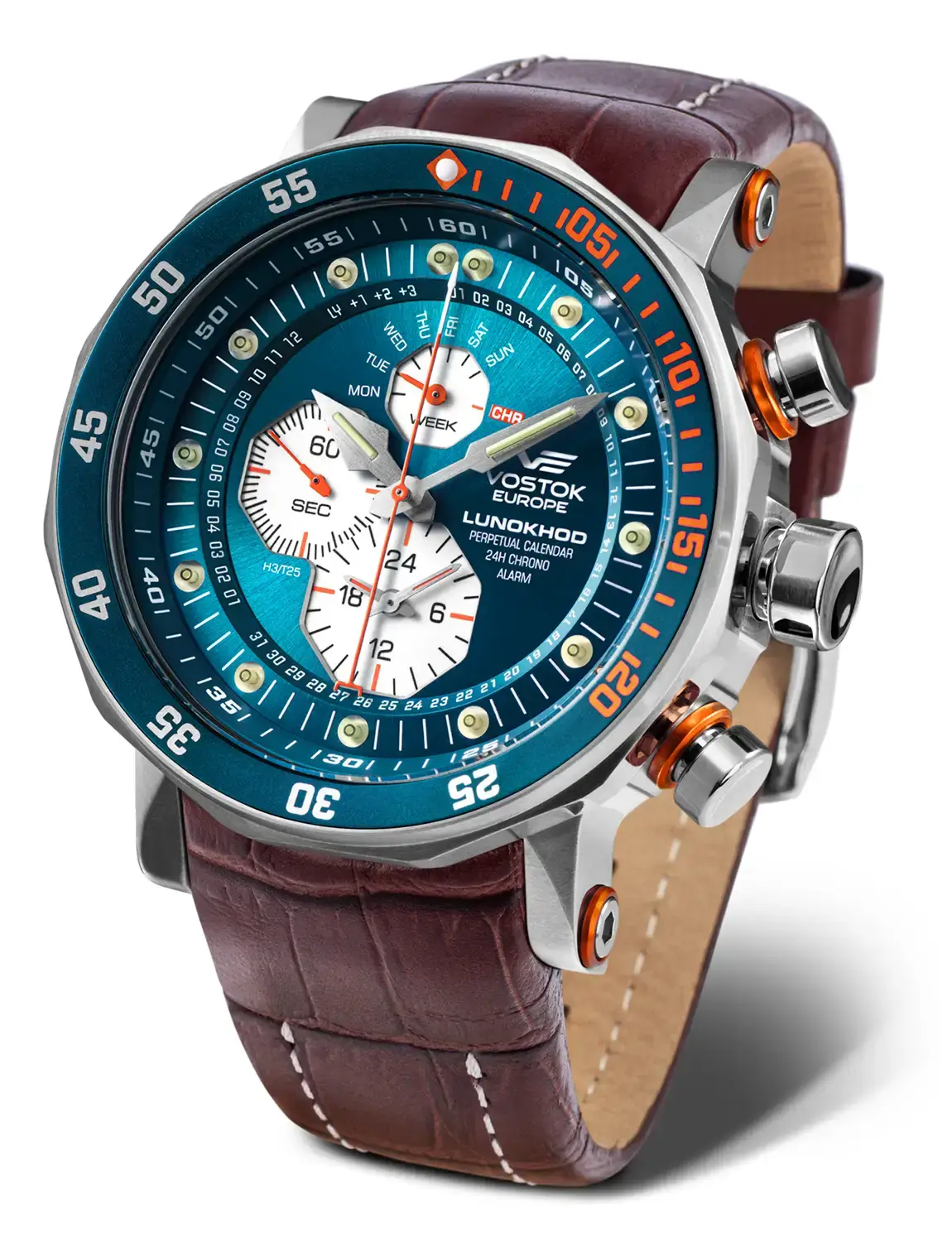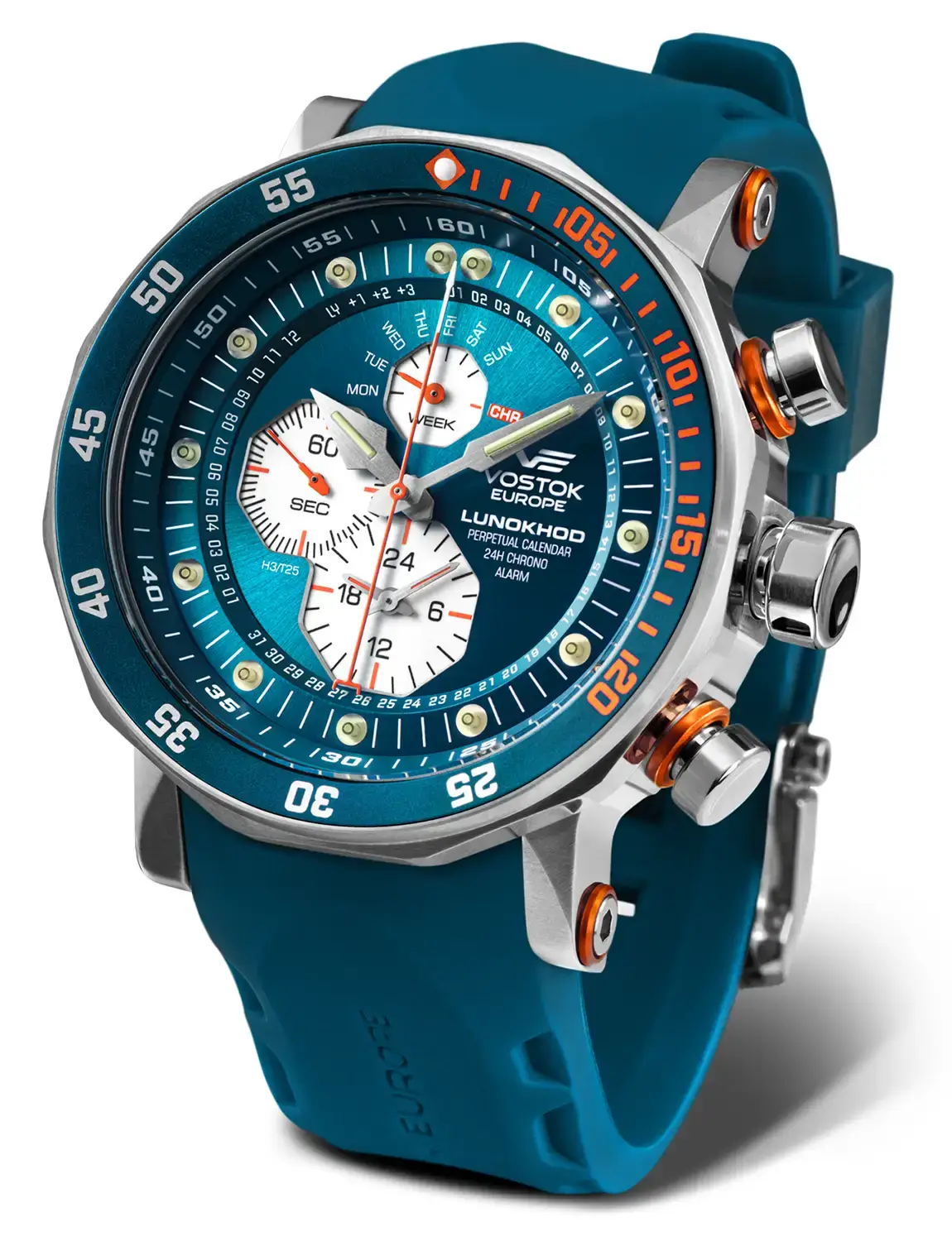 Multifunkční pánské hodinky Vostok Europe Lunokhod-2 YM86-620A636 jsou modelem navrženým pro ty, kteří překračují hranice svých možností – jak pod vodou, tak ve vesmíru. Jejich masivní 49mm pouzdro z nerezové oceli nejen zaujme svou robustností, ale je také vybaveno profesionální potápěčskou lunetou, což z nich činí ideální volbu pro nadšence hlubinného potápění. Vodotěsnost do 200 metrů (třída odolnosti přibližně 20 barů) zajišťuje spolehlivost i v extrémních podmínkách. Další výhodou je automatický heliový ventil, který se aktivuje při kritickém rozdílu tlaku, díky čemuž jsou tyto profesionální potápěčské hodinky ideální pro dlouhodobé ponory v prostředí s plynovými směsmi a poskytují neocenitelnou podporu profesionálním potápěčům.