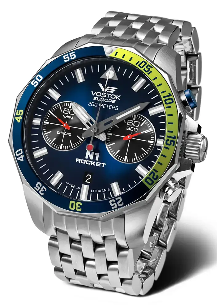 Estetika modelu Rocket N1 s referencí 6S21-225A708B kombinuje moderní design s klasickými prvky. Modrý ciferník s broušenou úpravou a modro-žlutá luneta dodávají hodinkám sportovní charakter, který je dále podtržen ocelovými indexy a trojúhelníkovým ukazatelem na 12. hodině. Použití Super-LumiNova na skeletonových ručičkách, indexech a lunetě zajišťuje vynikající čitelnost ve tmě. Sportovní pánské hodinky na náramku Vostok Europe N1 Rocket jsou vybaveny quartzovým strojkem Miyota 6S21 se stopkami a datem, který zaručuje spolehlivost a přesnou funkčnost. Funkce rychlého resetu (quick reset) umožňuje okamžité nastavení ručiček do výchozí polohy, čímž zvyšuje komfort a přesnost používání. Vostok Europe 6S21-225A708B je kombinací odolnosti, modernosti a jedinečného designu, který uspokojí každého milovníka hodinek i nadšence do vesmíru.