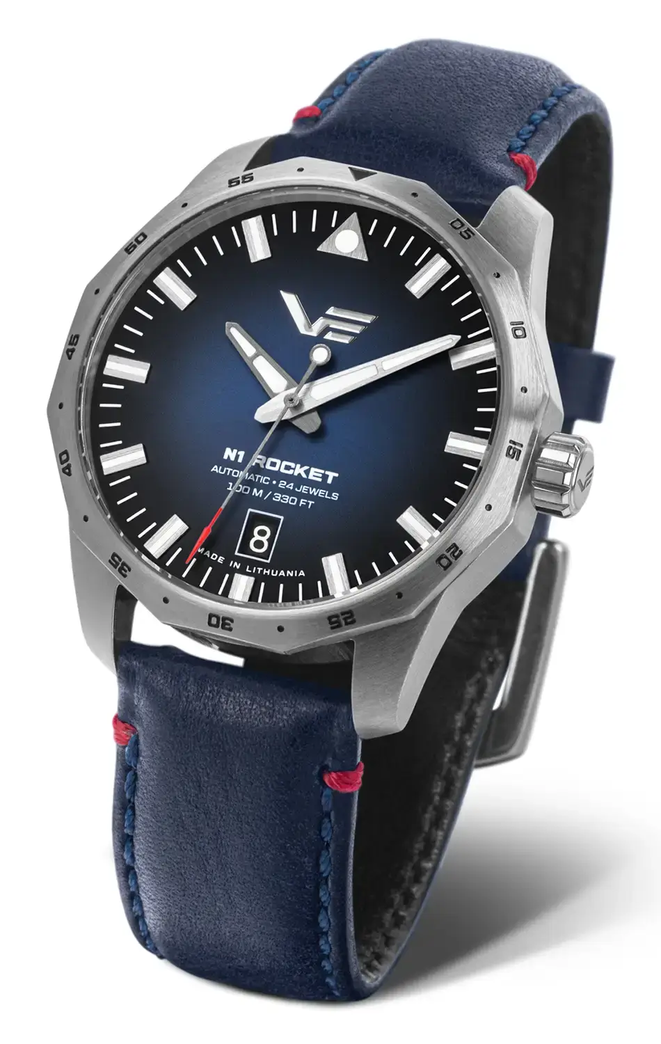 Model Rocket N1 Compact však není jen impozantní symbolikou. Motto značky Vostok Europe se zde odráží jak v technickém provedení, tak v designových detailech. Označení „Compact“ odkazuje na praktický průměr 39 mm, v němž bylo navrženo pouzdro s kartáčovanou povrchovou úpravou a lomenými boky, které mu dodávají technický charakter. Luneta, jejíž hrany rovněž vynikají ostrými fazetami, je doplněna minutovou stupnicí složenou z dvouciferných arabských číslic, teček a charakteristického obráceného trojúhelníku na pozici 12 – detailu typického pro pilotní hodinky. Pouzdro doplňuje hladký řemínek z přírodní modré kůže, ozdobený čtyřmi kontrastními červenými stehy, které ladí s koncem sekundové ručky. Celku tak dodávají elegantní vzhled s nádechem sportovně-vintage stylu.