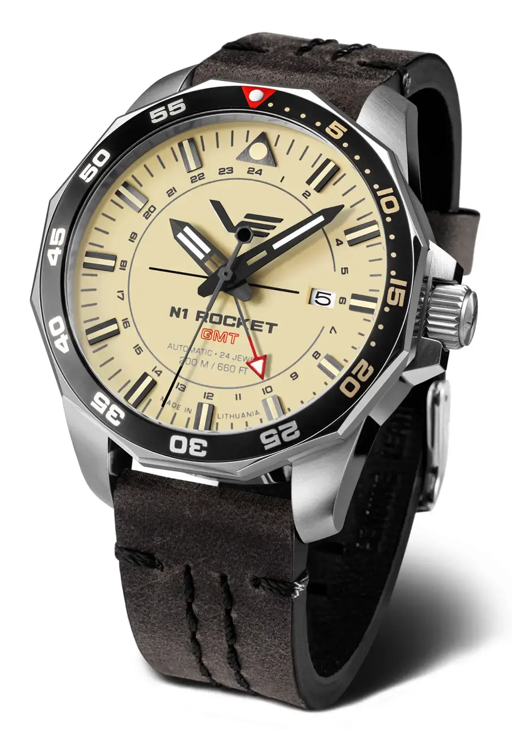 Pánské hodinky s funkcí druhého časového pásma N1 Rocket se vyznačují především zcela luminiscenčním číselníkem, který ve tmě vytváří spektakulární efekt v surovém, nástrojovém stylu. Ve dne zaujme elegantním béžovým odstínem, který dokonale ladí s černými kartáčovanými indexy a ručičkami, rámečkem a tmavě hnědým řemínkem z přírodní kůže s černým vintage prošíváním. Robustní pouzdro z ušlechtilé oceli o rozměrech 46 mm x 17 mm je vybaveno šroubovací korunkou, což zajišťuje odolnost a funkčnost. Každý kus patří do limitované edice pouhých 3000 kusů, přičemž číslo limitace je vyryto na zadním víku ve formátu 0000/3000, což podtrhuje jeho jedinečnost.