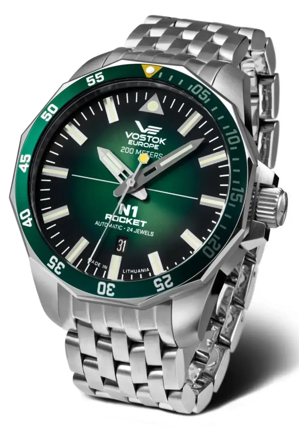 Vostok Europe Rocket N1 se vyznačuje voděodolností až do 200 metrů a robustní konstrukcí s pouzdrem o průměru 46 mm a tloušťce 17 mm. Tvrdé minerální sklo K1 o tloušťce 4,5 mm s antireflexní vrstvou poskytuje odolnost a čitelnost za jakýchkoliv podmínek. Jednosměrný otáčecí lunetový kroužek, šroubovací korunka a dýnko dělají z těchto velkých pilotních hodinek ideální společníky pro extrémní výzvy i každodenní nošení. Jejich mnohodílný náramek s motýlkovým zámkem na 2 tlačítkách skvěle ladí s zeleným broušeným ciferníkem s stříbrnými indexy a ručičkami pokrytými Super-LumiNovou.