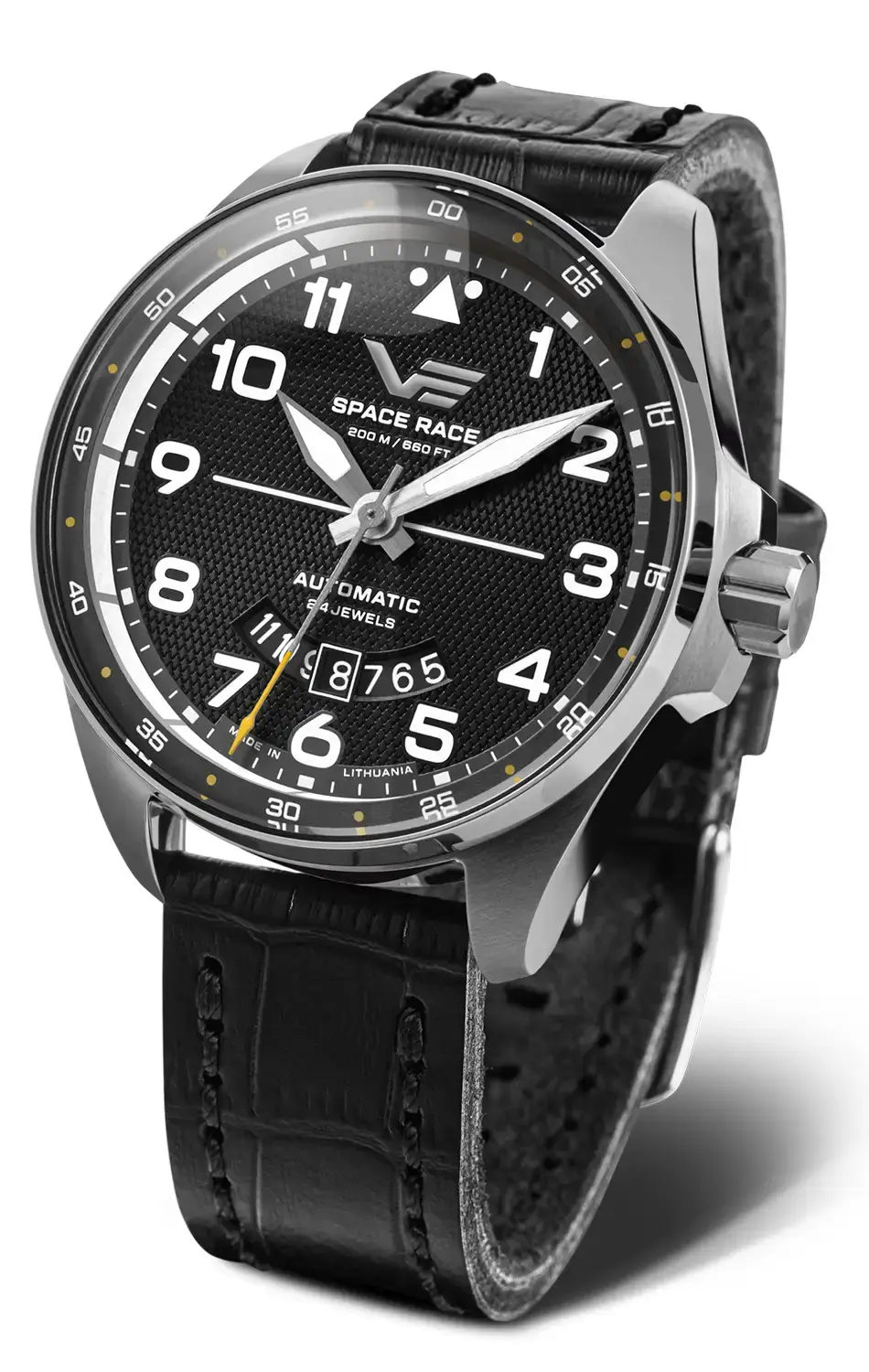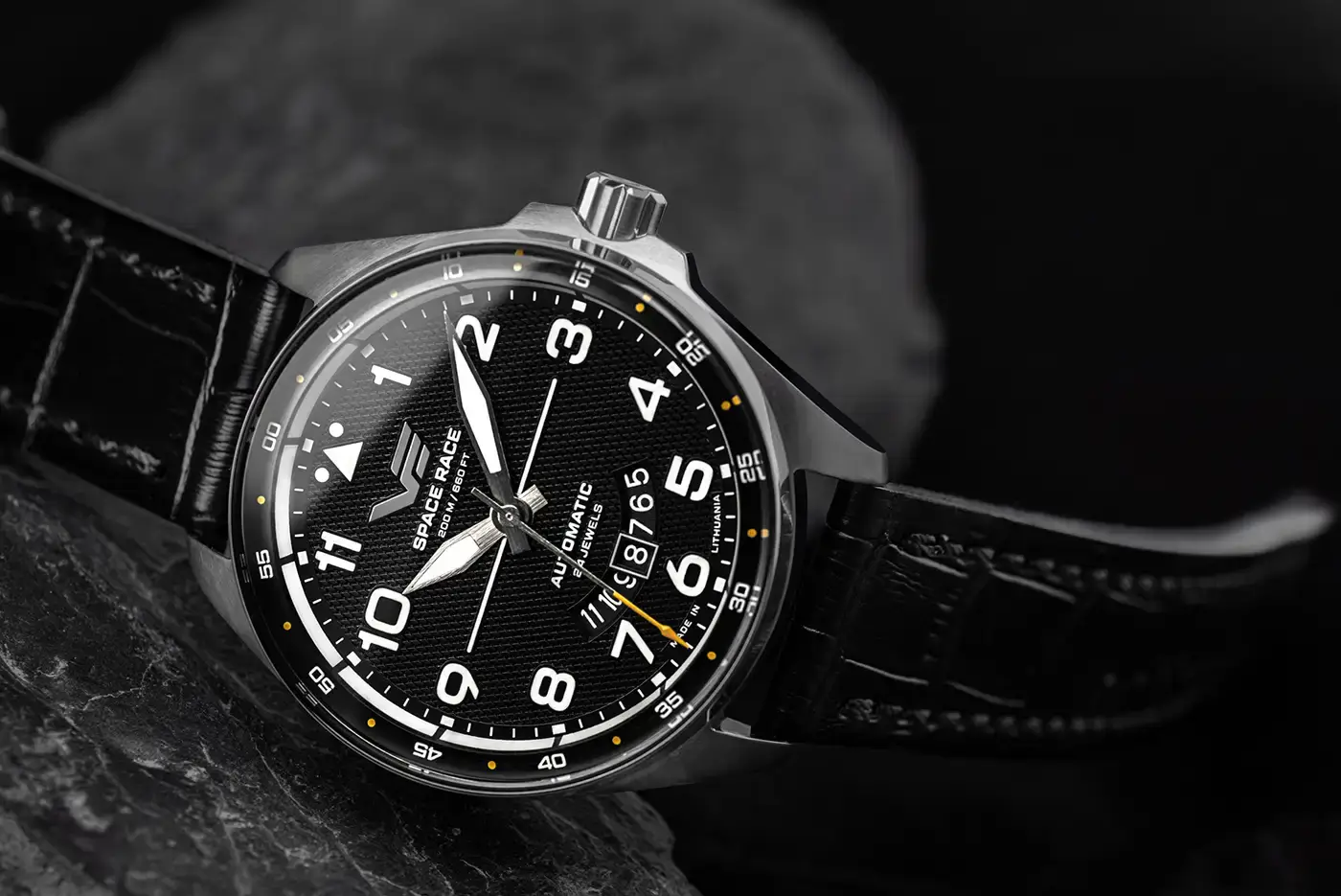 Ústředním prvkem designu je texturovaný číselník s efektním panoramatickým datem, inspirovaný palubními přístroji a klasickými leteckými ukazateli, který vizuálně znázorňuje mechaniku plynutí dnů. Číselník chrání odolné minerální sklo K1 s antireflexní vrstvou, které je známé svou vysokou odolností proti poškrábání a prasklinám. Charakteristickým prvkem konstrukce je umístění minutové stupnice pod sklem, což umožnilo přidání elegantního leštěného kroužku kolem číselníku. Vícevrstvý design spolu s velkými arabskými číslicemi odkazuje na klasický letecký styl, spojující estetiku s funkčností. Vnitřní kroužek číselníku s luminiscenčním sklonem zajišťuje vynikající čitelnost i ve slabém osvětlení, což činí tyto letecké hodinky z kolekce Space Race ideálním společníkem pro každodenní nošení i náročné situace.