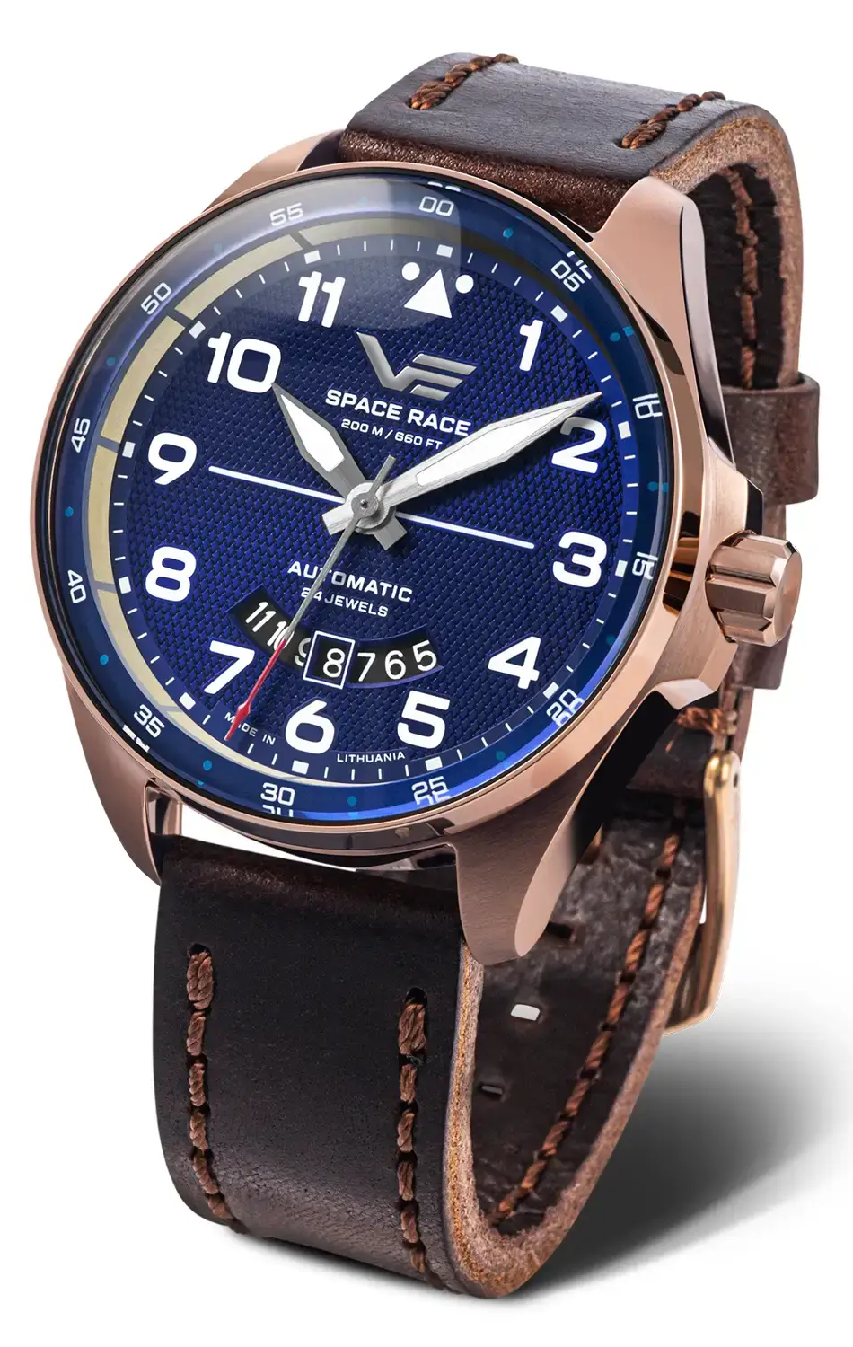 Limitované pánské hodinky Vostok Europe Space Race NH35A-325B746 jsou poctou historickému vesmírnému závodu, jehož symbolickým završením byla mise Apollo-Sojuz v roce 1975. Tyto pilotní hodinky ve vintage stylu spojují nadčasovou eleganci s pokročilou technologií. Každý kus z limitované edice, čítající pouhých 3000 číslovaných exemplářů, má robustní 46mm pouzdro vyrobené z vysoce kvalitní nerezové oceli s kartáčovanou a leštěnou povrchovou úpravou. Povlak PVD v teplém odstínu růžového zlata dodává hodinkám jedinečný charakter, zatímco působivá vodotěsnost až do cca 200 metrů zajišťuje odolnost v různých podmínkách. Šroubovací zadní víčko, zdobené gravírováním zobrazujícím Zemi z oběžné dráhy, a šroubovací korunka poskytují spolehlivou ochranu mechanismu i v extrémních situacích.