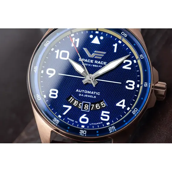 Hlavním prvkem designu je texturovaný číselník s efektním panoramatickým datem, inspirovaným palubními přístroji a klasickými leteckými ukazateli. Tento mechanismus zobrazení data podtrhuje dynamický charakter hodinek a vizuálně ilustruje plynutí dnů. Číselník je chráněn odolným minerálním sklem K1 s antireflexní vrstvou, které je známé svou vysokou odolností proti poškrábání a prasklinám. Charakteristickým prvkem konstrukce je umístění minutové stupnice pod sklem, což umožnilo přidání elegantního leštěného kroužku kolem číselníku. Vícevrstvý design spolu s velkými arabskými číslicemi odkazuje na klasický letecký styl, spojující sofistikovanou estetiku s funkčností. Vnitřní kroužek číselníku s luminiscenčním sklonem zajišťuje vynikající čitelnost i ve slabém osvětlení, což činí tyto letecké hodinky z kolekce Space Race ideálním společníkem jak pro každodenní nošení, tak pro náročné situace.