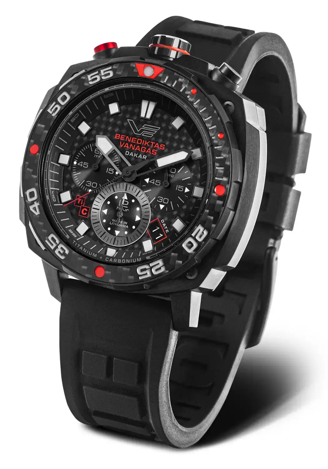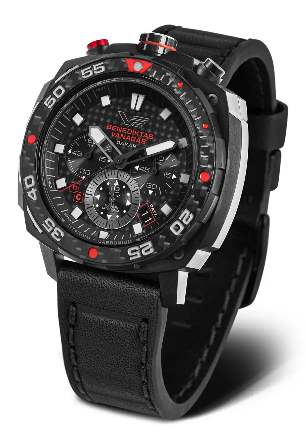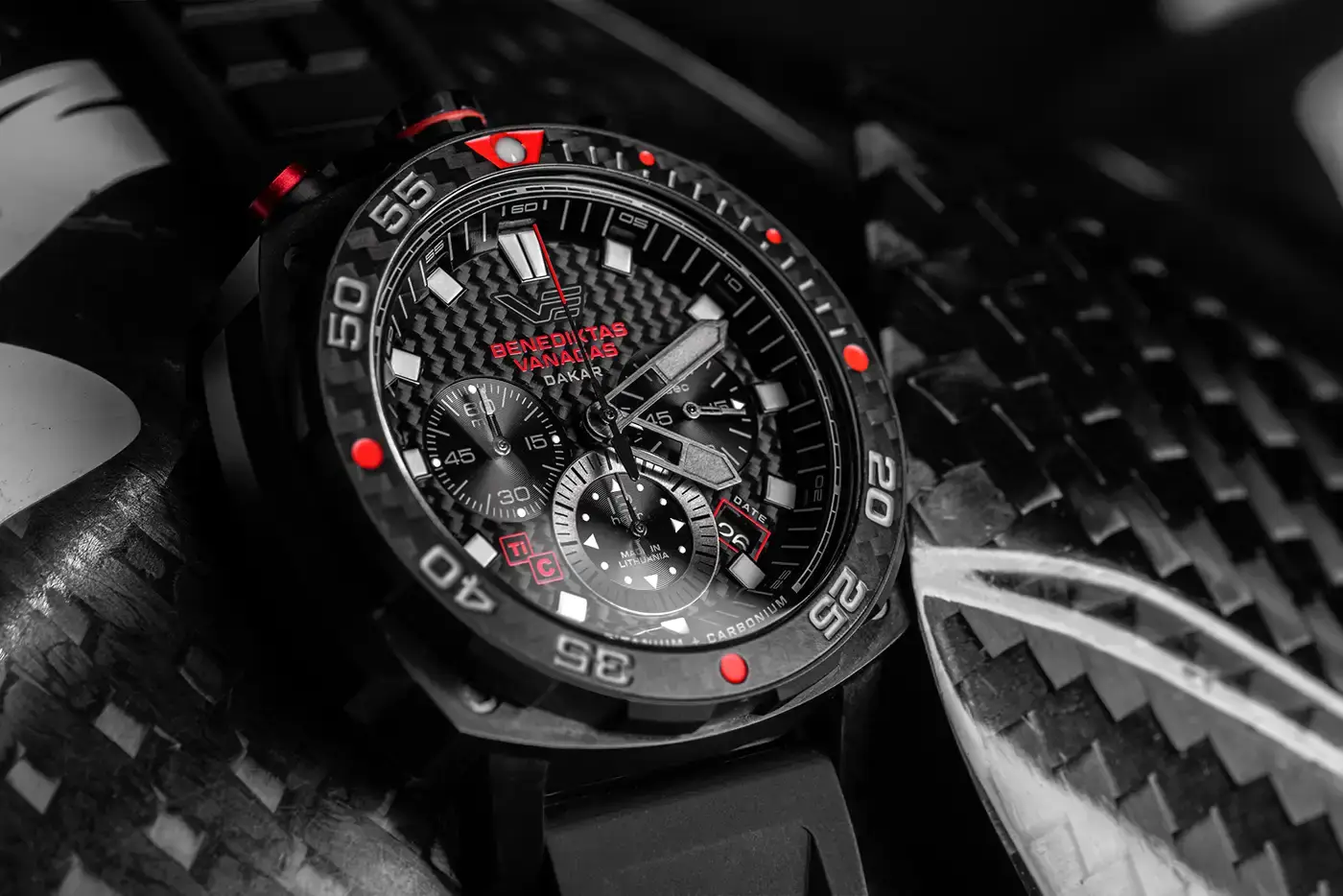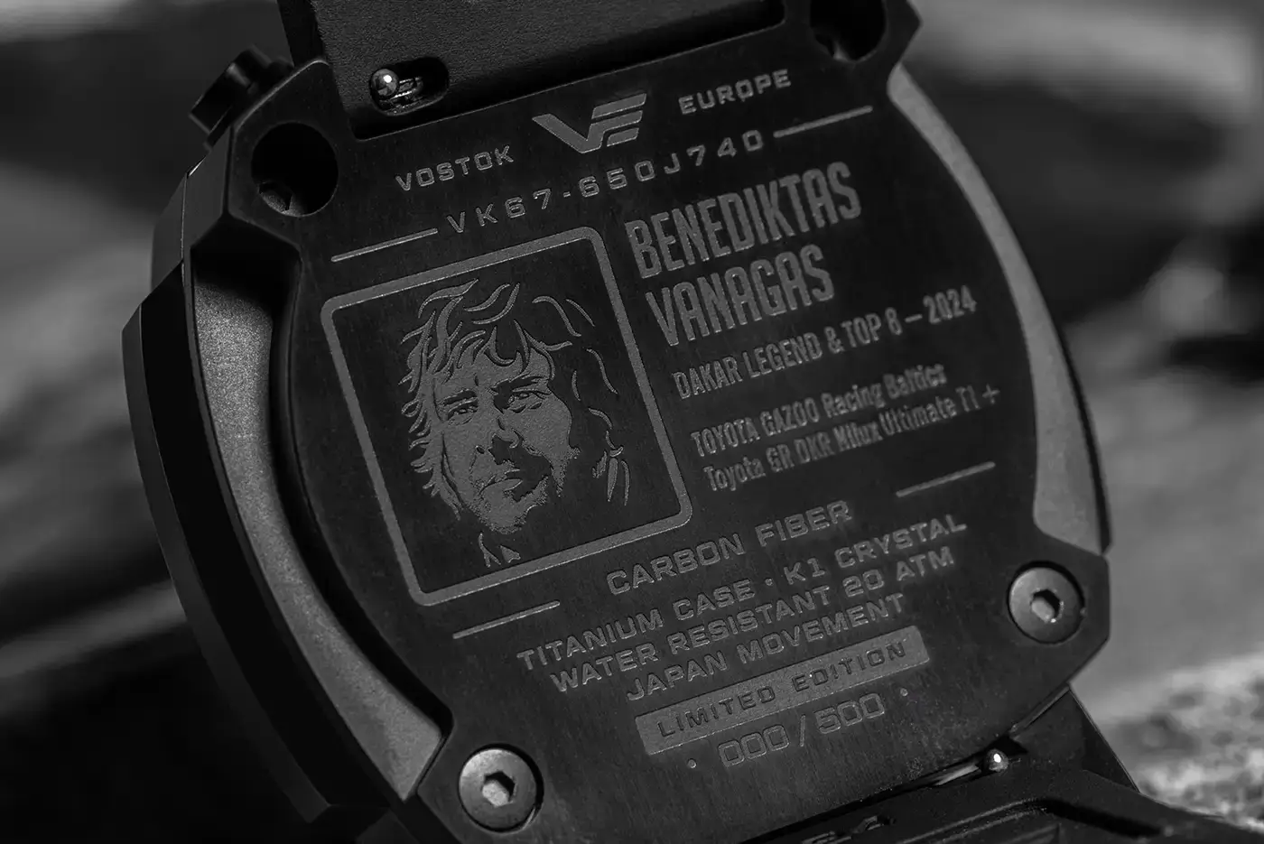 Klíčovým prvkem modelu Vostok Europe VK67-650J740 je uhlíkové vlákno – materiál známý svou pevností a lehkostí, který je také používán na karoseriích závodních vozů Benediktase Vanagase. Uhlíkové vlákno bylo použito na vícevrstvém ciferníku a lunetě, což dodává hodinkám Dakar Edition jedinečný a moderní vzhled. Ergonomický asymetrický zadní kryt a tlačítka chronografu umístěná v horní části pouzdra jsou dokonale přizpůsobeny potřebám závodních řidičů – umožňují přesné ovládání hodinek bez nutnosti sundávání rukou z volantu.