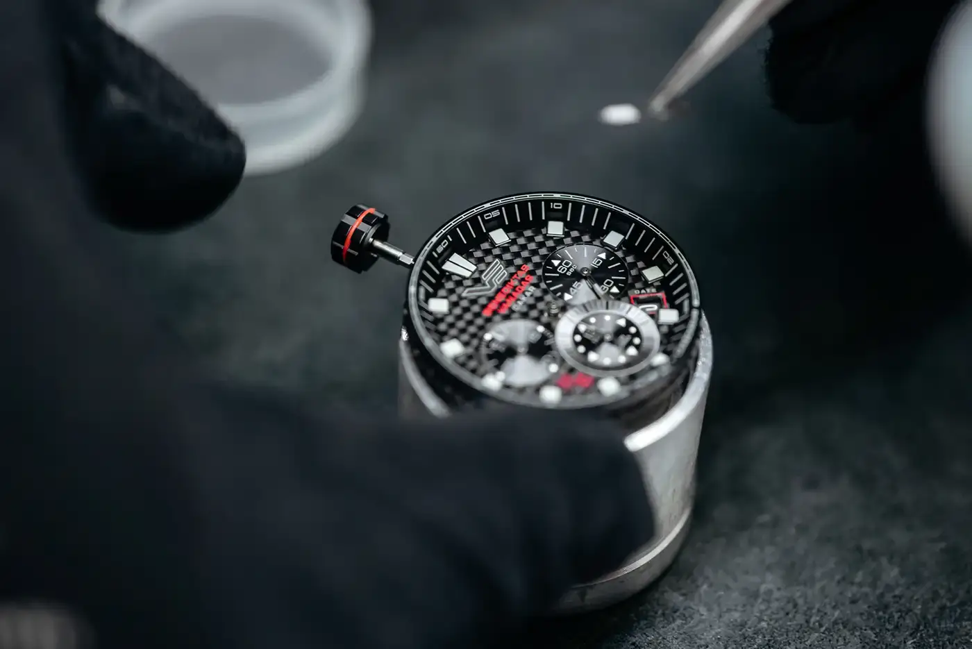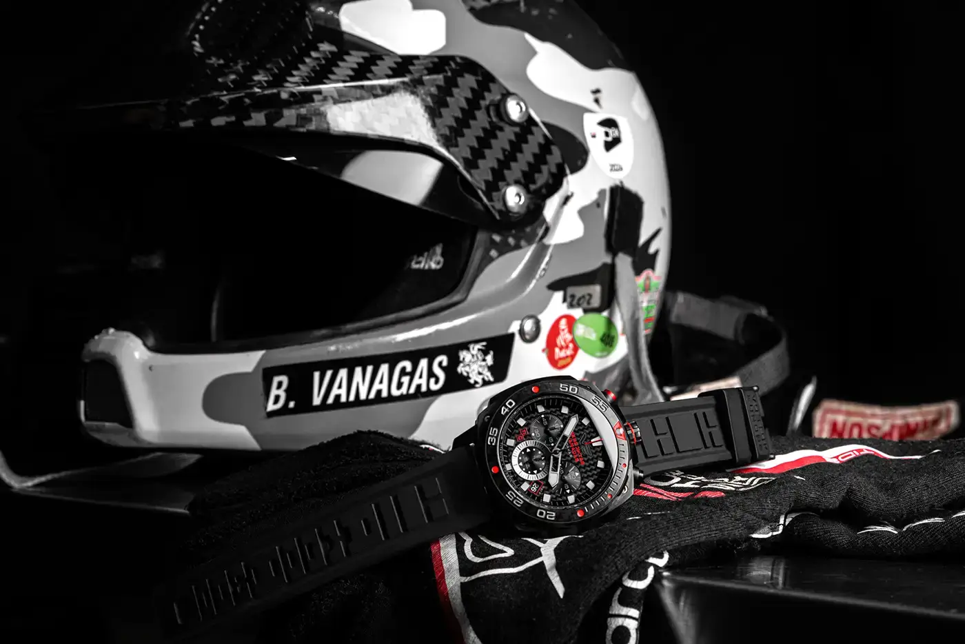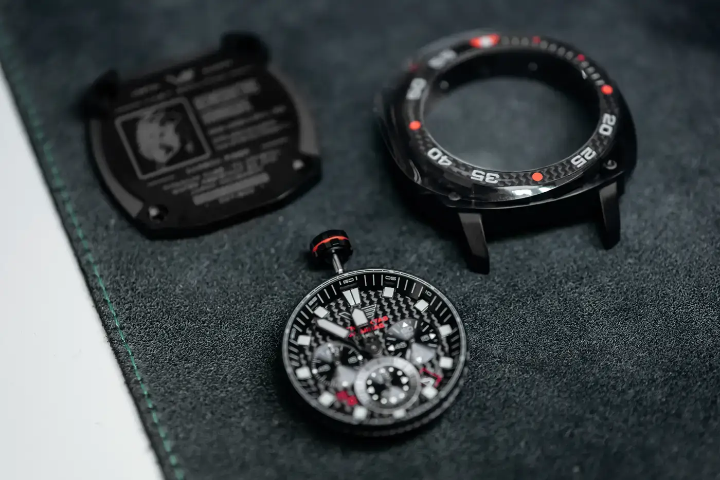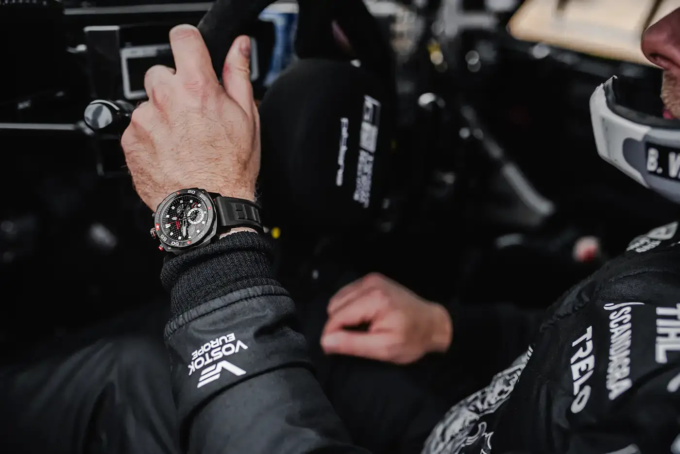 Klíčovým prvkem modelu Vostok Europe VK67-650J740 je uhlíkové vlákno – materiál známý svou pevností a lehkostí, který je také používán na karoseriích závodních vozů Benediktase Vanagase. Uhlíkové vlákno bylo použito na vícevrstvém ciferníku a lunetě, což dodává hodinkám Dakar Edition jedinečný a moderní vzhled. Ergonomický asymetrický zadní kryt a tlačítka chronografu umístěná v horní části pouzdra jsou dokonale přizpůsobeny potřebám závodních řidičů – umožňují přesné ovládání hodinek bez nutnosti sundávání rukou z volantu.
