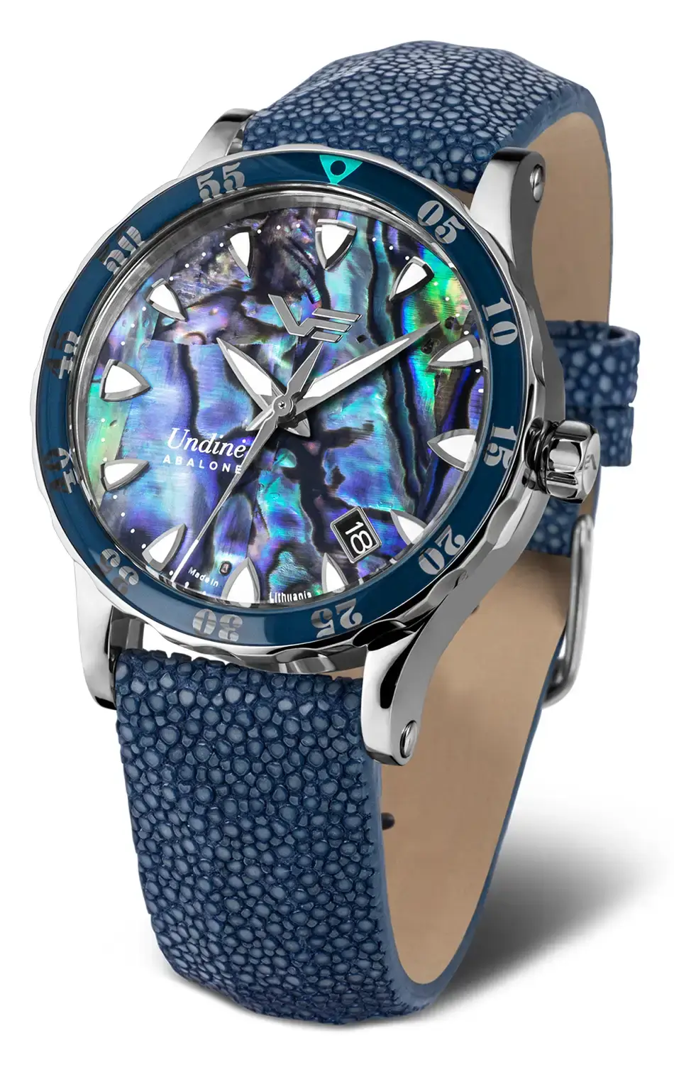 Číselník z přírodní mušle abalone se vyznačuje jedinečným, hypnotizujícím vzorem s opalizujícími barvami, díky čemuž je každý kus naprosto originální. Tyto exkluzivní hodinky s perleťovým číselníkem jsou skutečným uměleckým dílem, které okouzlí svým luxusním vzhledem. Přírodní perleť na číselníku odkazuje na legendární vodní nymfy Undine, symboly tajemství a ženské síly. Zdobený rotor s motivem Côtes de Genève dodává hodinkám prestiž a zdůrazňuje jejich vysokou kvalitu. Součástí balení jsou tři řemínky – luxusní z rejnokové kůže a dva silikonové v bílé a modré barvě, což činí z tohoto modelu dokonalé dámské hodinky s vyměnitelnými řemínky, vhodné pro každou příležitost. K dispozici je také elegantní nerezový náramek.