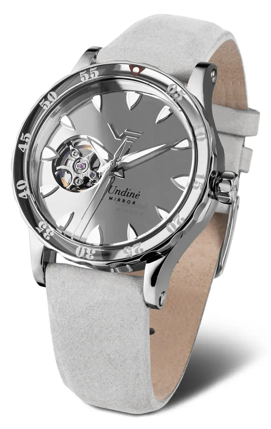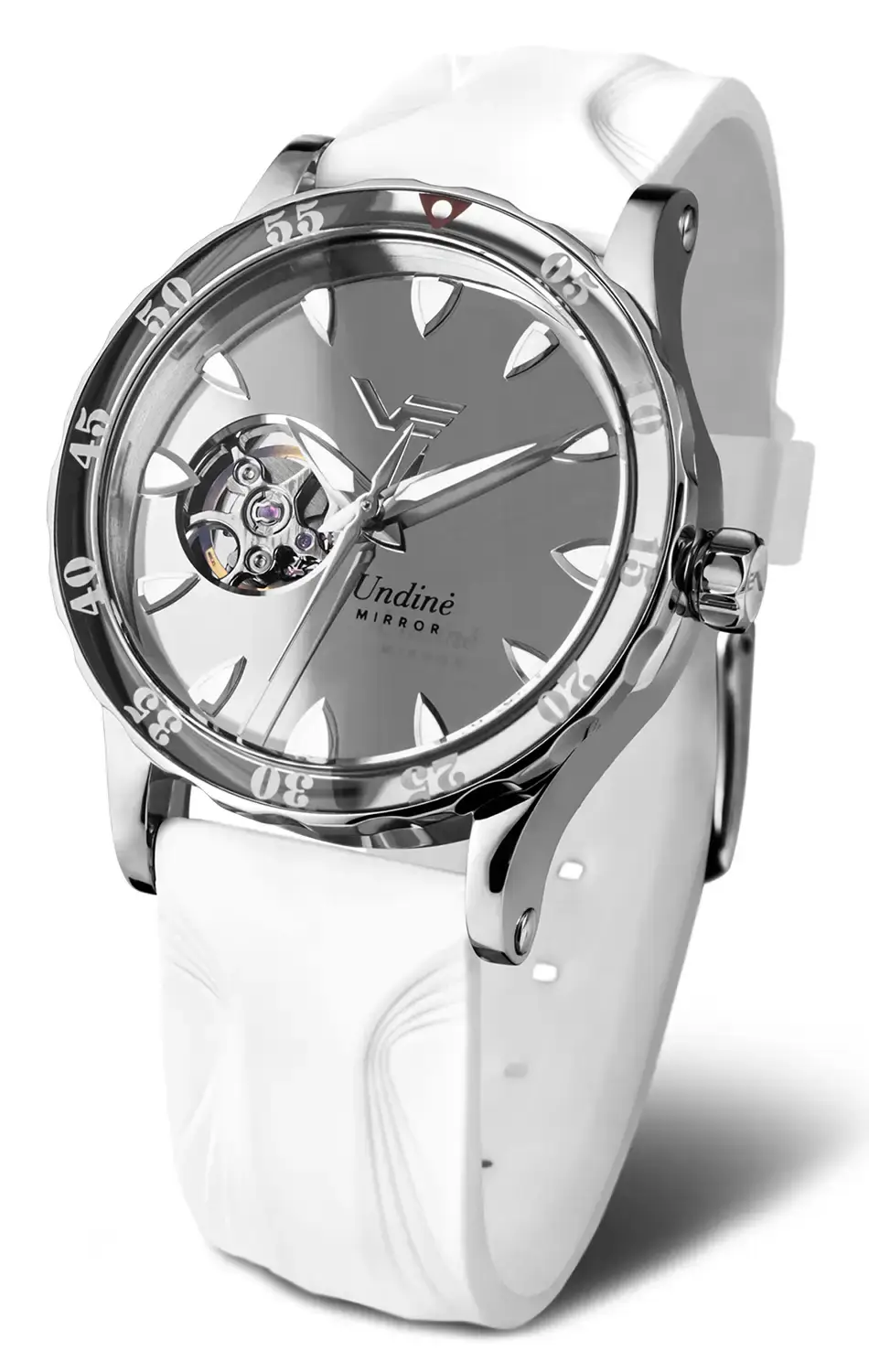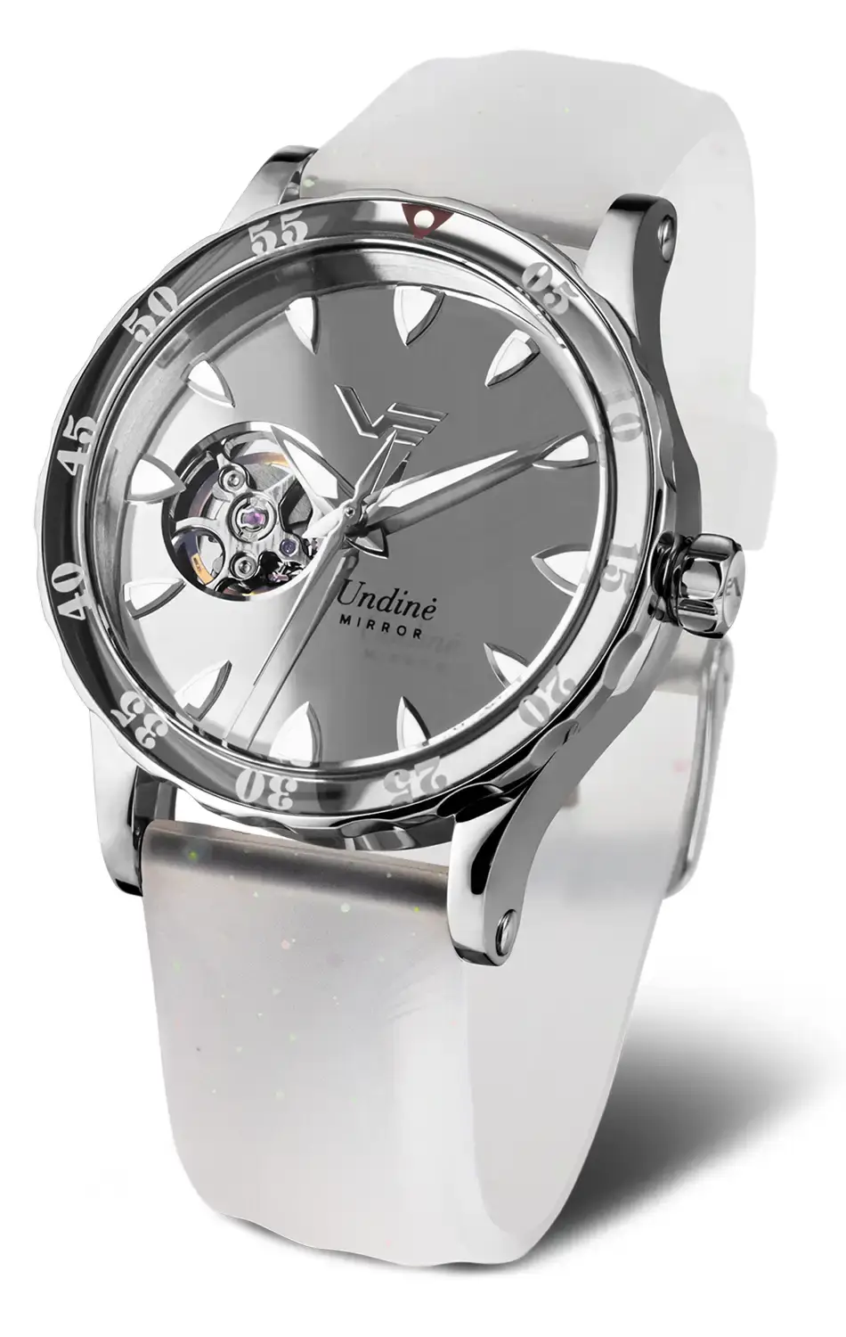 Vostok Europe Undine Mirror Limited Edition NH38A-515A765 je výjimečné dámské hodinky open heart, které spojují eleganci, preciznost a inspiraci mytologií. Jejich název odkazuje na Undiny – tajemné vodní nymfy z baltské a germánsko-skandinávské mytologie. Podle legend byly Undiny krásnými, éterickými bytostmi obývajícími jezera, řeky a moře. Jejich půvab a magické kouzlo dokázaly okouzlit námořníky, přičemž jejich povaha spojovala krásu s nepředvídatelností vody. Právě tato mystická energie se stala inspirací pro model Vostok Europe Mirror, jehož hladký, zrcadlový číselník vyrobený z leštěného kovu odráží světlo podobně jako měsíční záře na vodní hladině. Pouzdro z oceli 316L o průměru 39 mm, šroubovací průhledné dýnko a voděodolnost až 20 ATM (200 m) dělají z těchto hodinek nejen stylový, ale i mimořádně odolný dámský potápěčský model Vostok.