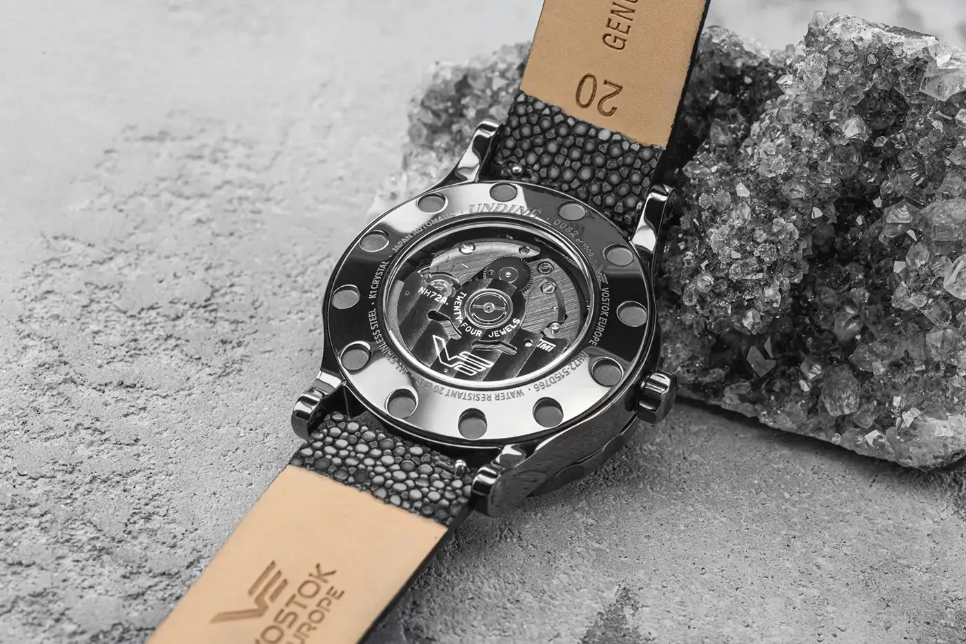 Vostok Europe Undine Rebel Limited Edition NH72-515D766 je výjimečné dámské hodinky Vostok, které kombinují sportovní styl s elegancí, inspirované mýtickými vodními nymfami Undine. Tento model se vyznačuje neobyčejnou přesností a všestranností. Pouzdro o průměru 39 mm, vyrobené z nerezové oceli 316L, je potaženo šedou vrstvou, která mu dodává moderní vzhled. Dámské hodinky s vyměnitelnými řemínky umožňují přizpůsobit je každé příležitosti – v sadě jsou tři řemínky: exkluzivní řemínek z rejnokové kůže a dva silikonové v černé a bílé barvě, které lze snadno vyměnit díky systému rychlého upevnění. Vodotěsnost na úrovni přibližně 20 ATM (200 metrů) a otočný potápěčský kroužek z nich činí ideální volbu i pro milovnice vodních sportů – dámské potápěčské hodinky Vostok zajišťují spolehlivost při každodenním nošení i venkovních aktivitách.