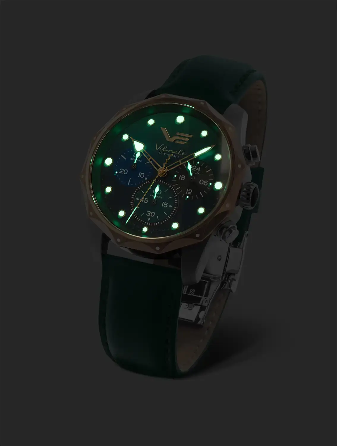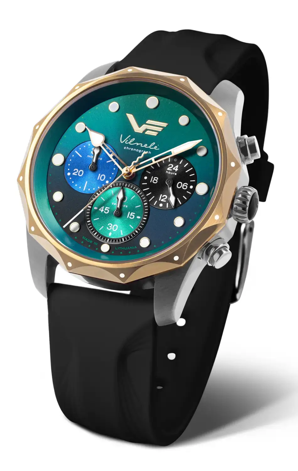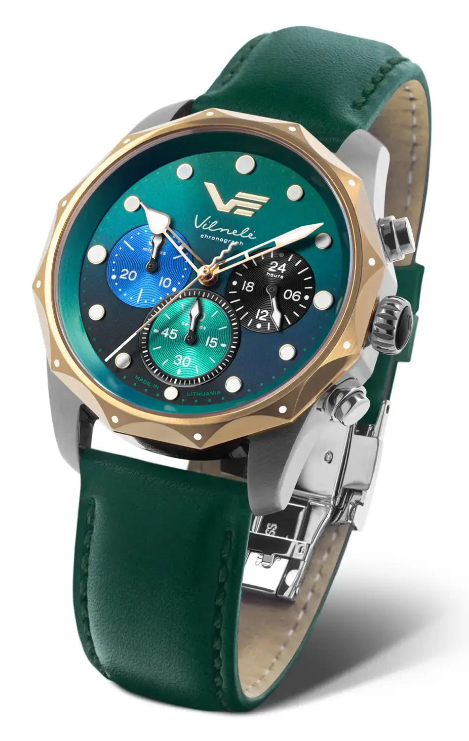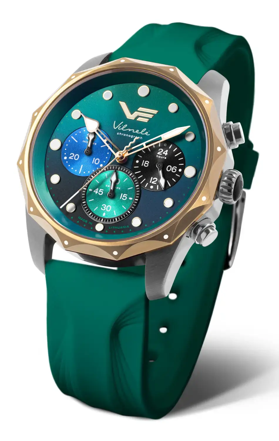 Vostok Europe Vilnele Chrono Limited Edition byly vytvořeny pro ženy, které si cení detailů s hlubokým významem. Křemenný chronograf s 30minutovým čítačem, malou vteřinovkou a 24hodinovým ukazatelem, dvoubarevné pouzdro o průměru 39 mm, lehce vypouklé safírové sklíčko s antireflexní vrstvou a působivá vodotěsnost přibližně 10 ATM/100 metrů (ideální pro plavání a šnorchlování) dělají z těchto hodinek spolehlivého společníka pro každou příležitost. Sada tří vyměnitelných řemínků – luxusního koženého s motýlkovou sponou a dvou sportovních silikonových v odstínech černé a zelené – umožňuje snadno přizpůsobit tyto dvoubarevné hodinky jakémukoli stylu a zůstat věrná filozofii kolekce: spojení elegance, kvality a přírodní inspirace.