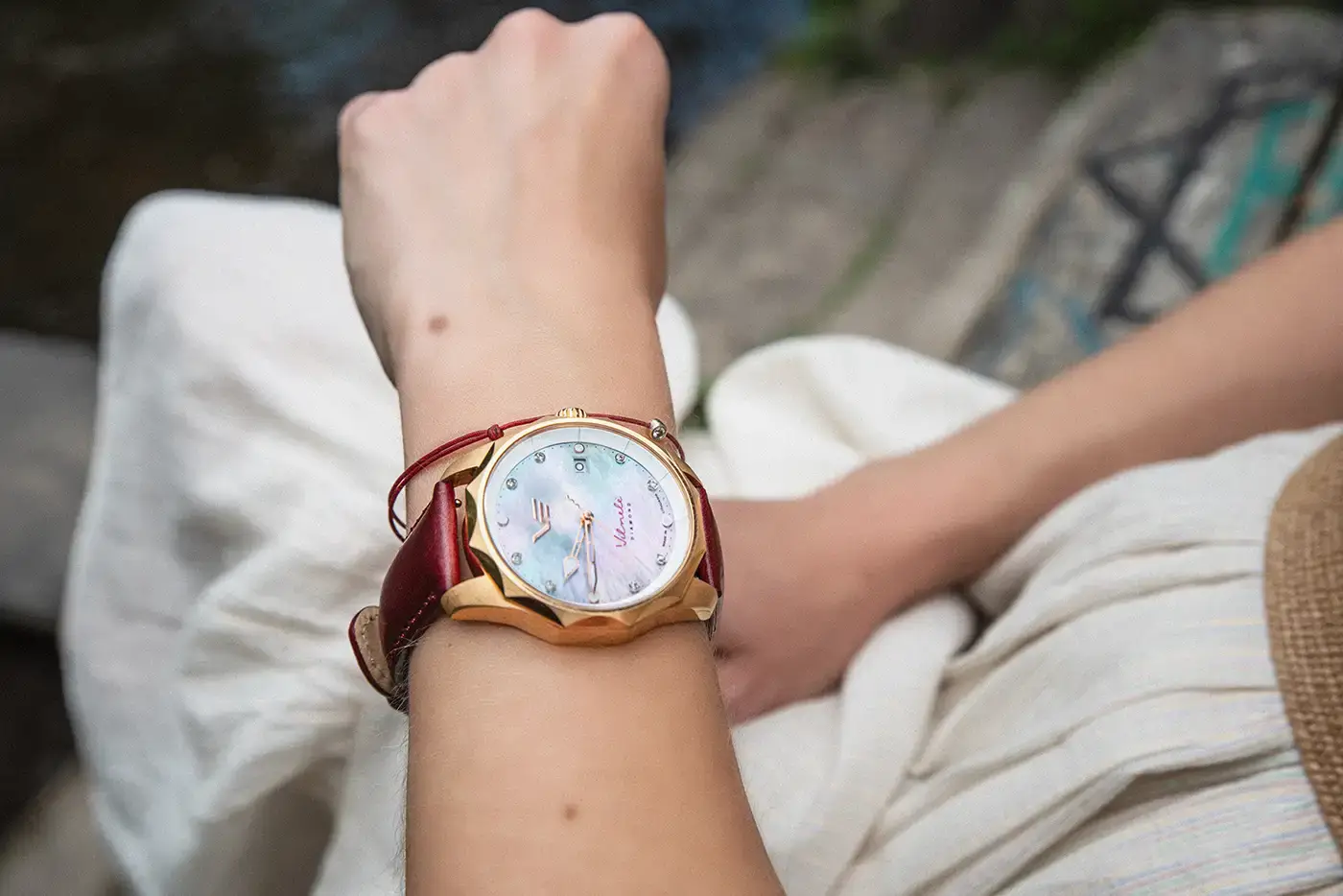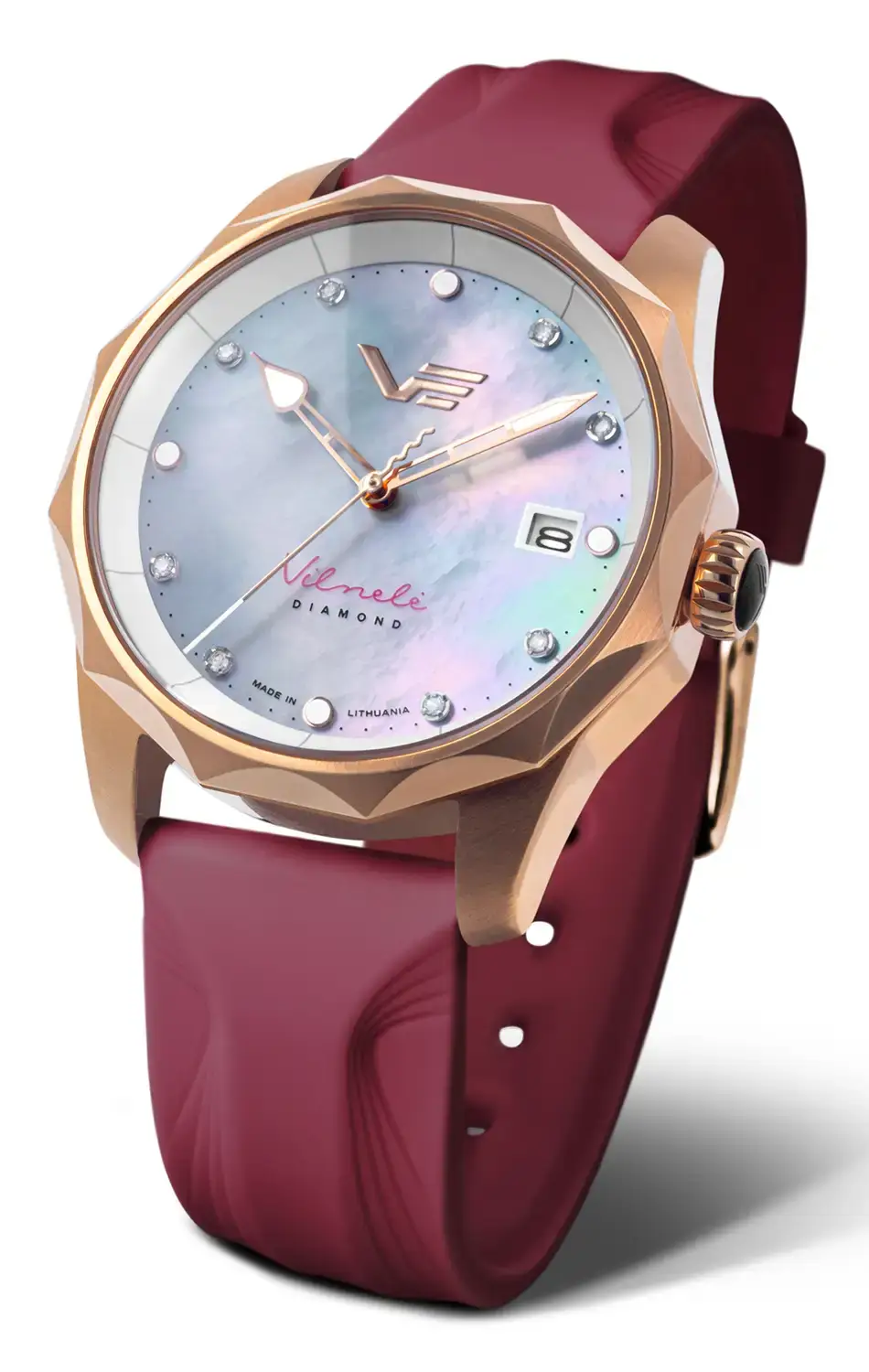 Dámské solární hodinky Vilnele Solar jsou dostupné v limitované edici 3000 kusů a podtrhují výjimečnost každé majitelky. Součástí balení jsou vyměnitelné řemínky – kožený se zapínáním na tlačítko a dva silikonové v bordó a bílé barvě, které umožňují snadné přizpůsobení hodinek osobnímu stylu – od elegance po sportovní ležérnost. Hodinky Vilnele Diamond představují nejen mistrovský design, ale především harmonické spojení estetiky, preciznosti a symboliky přírody.