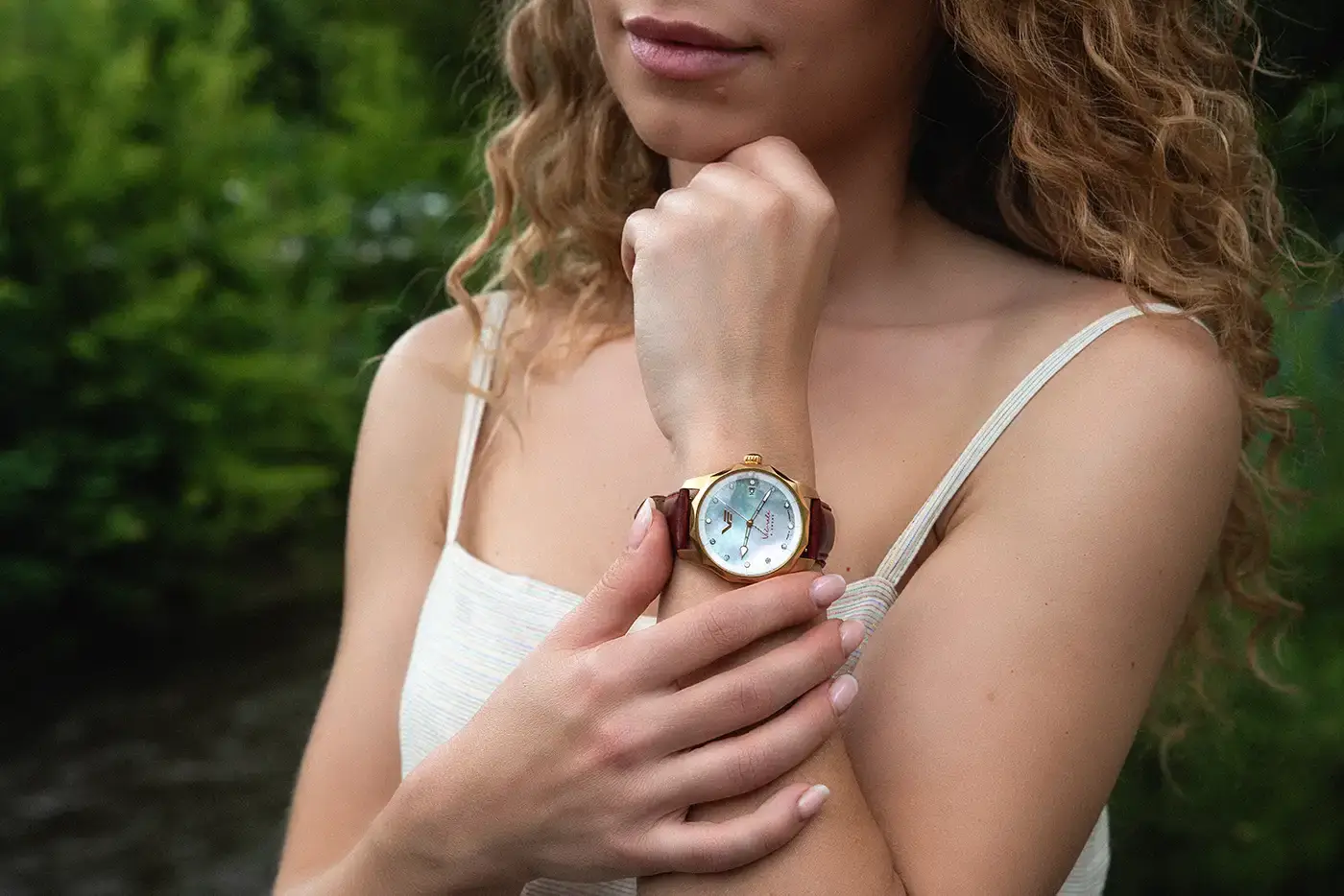 Dámské limitované hodinky s vyměnitelnými řemínky Vostok Europe Vilnele Diamond Solar VS42-125B754 jsou esencí ženské elegance inspirované přírodou a historií Vilniusu. Design hodinek čerpá ze subtilní dynamiky řeky Vilnelė, která malebně protéká srdcem litevské metropole, objímá historické čtvrti a zelené parky. Charakteristická vlnitá luneta, jemně zakřivené linie pouzdra a okouzlující perleťový ciferník odrážejí přirozený rytmus vody a přinášejí do každodenního života nádech poetické krásy. Zlaté pouzdro z ušlechtilé oceli 316L o průměru 39 mm je pokryto luxusní PVD vrstvou v odstínu růžového zlata, která dodává hodinkám vytříbený lesk, ladící jak s městským stylem, tak i s večerní elegancí.