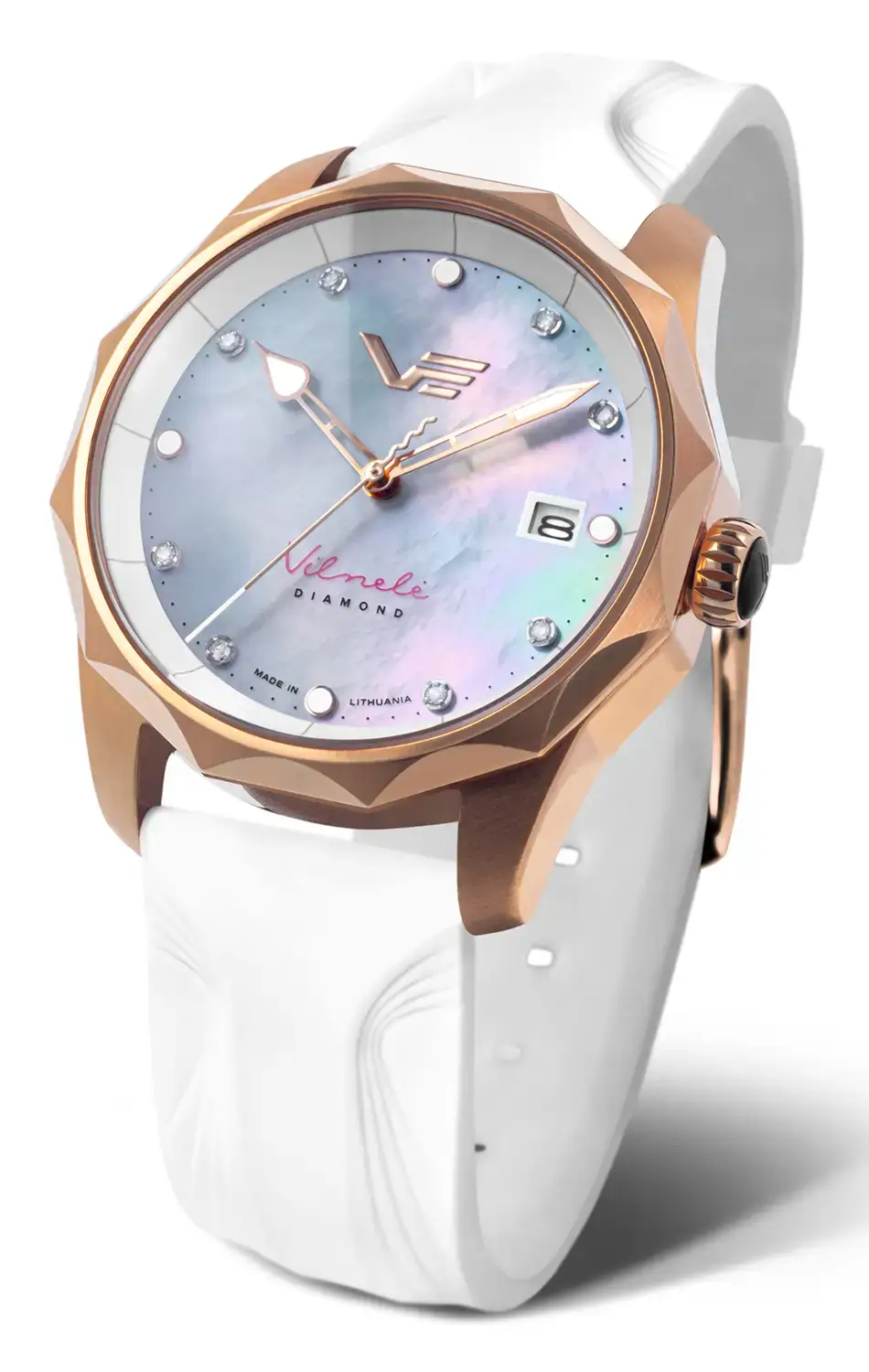 Srdcem modelu Vilnele Diamond Limited Edition je precizní solární strojek Seiko Epson VS42, který se nabíjí světlem – přirozeným i umělým – a eliminuje potřebu výměny baterie. Hodinky nabízejí praktické funkce hodin, minut, sekund a data, zatímco jemně klenuté safírové sklíčko s antireflexní vrstvou zajišťuje dokonalou čitelnost a odolnost proti poškrábání. Osm pravých diamantů decentně zdobí poloprůhledný perleťový ciferník a propůjčuje hodinkám šperkařský charakter, zatímco vodotěsnost do 100 metrů z nich činí nejen symbol luxusu, ale i spolehlivého každodenního společníka.