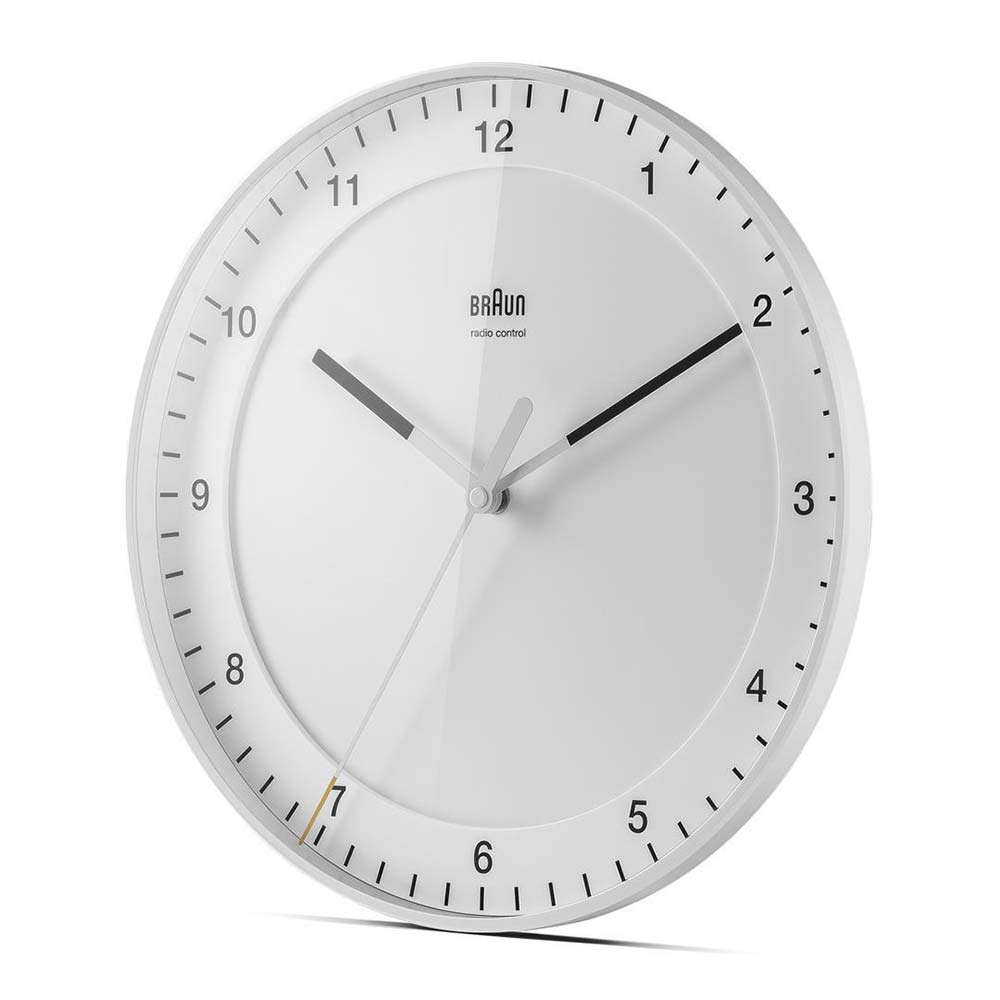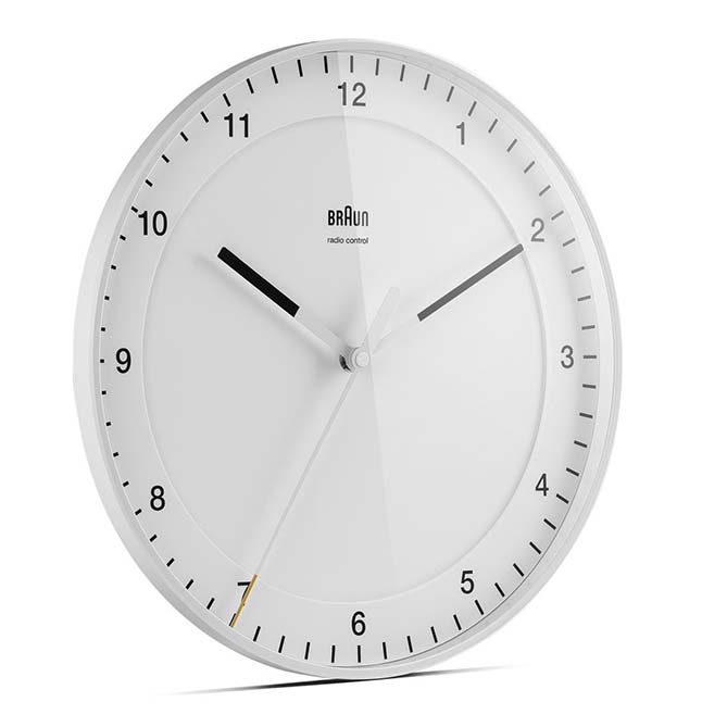 Rádiem řízené hodiny Braun BC17W-DCF. Dobrý design je nejmenší možný design. Nezatížený nedůležitými věcmi. BC17B-DCF má velké, snadno čitelné uspořádání číselníku a nadčasový design v souladu s 10 principy Ram. Mechanismus je tichý, vteřinová ručka se žlutou špičkou se pohybuje jedním souvislým pohybem po ciferníku. Žádné tikání – jen čas.
