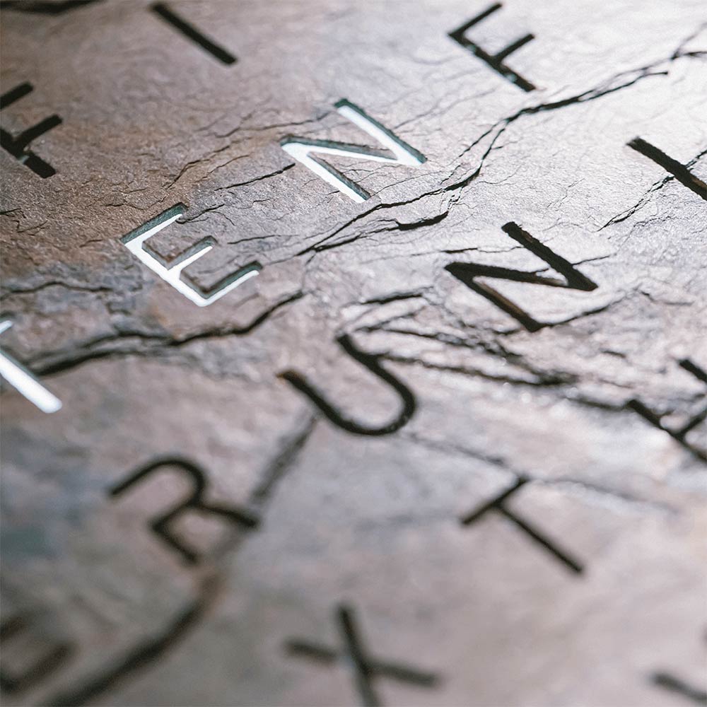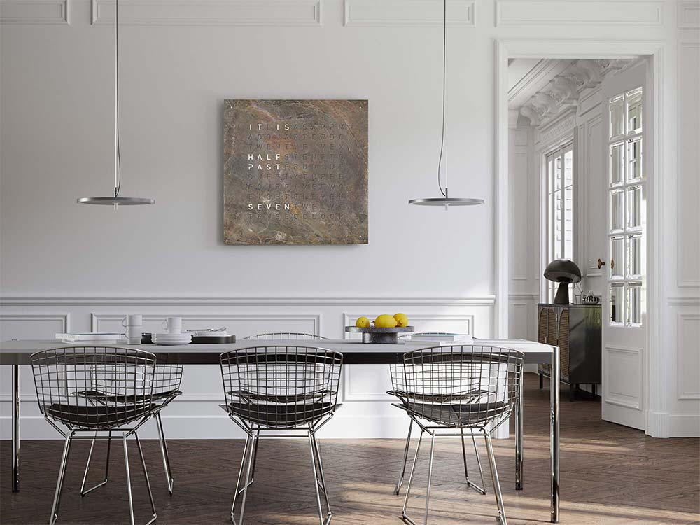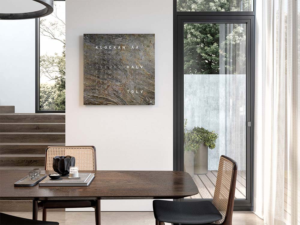 Hodiny Qlocktwo Earth 90 Creator's Edition Glintscape o rozměrech 90 × 90 cm pocházejí z prestižní řady továrních hodin Qlocktwo. Přední panel je ručně vyráběn speciálními a složitými technologickými postupy. Díky individuálnímu pojetí má každý kus svůj charakter a jedinečný vzor. Prezentovaný model Glintscape (břidlice) oživí interiér a soustředí oči všech ve stejné místnosti. Přední panel z milion let staré sedimentární horniny fascinuje jedinečným reliéfem s náhodnými nepravidelnostmi a perleťovým povrchem. Objekt svými zelenými, červenými a zlatými tóny připomíná podzimní krajinu odrážející se v jiskřivém jezeře. Vzácný přírodní kámen se snoubí v mimořádné jednotě s poetickým zobrazením času QLOCKTWO a vytváří jedinečný umělecký objekt. Každý kus je jiný, jedinečný a nenapodobitelný.