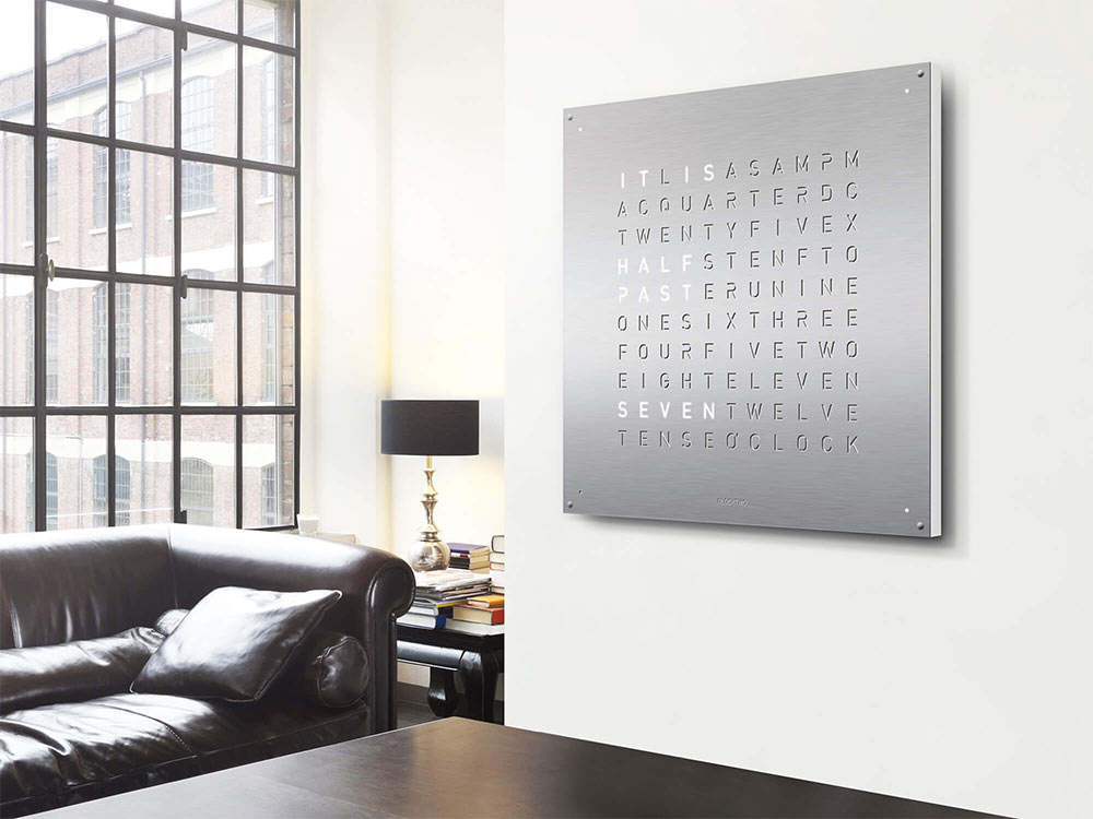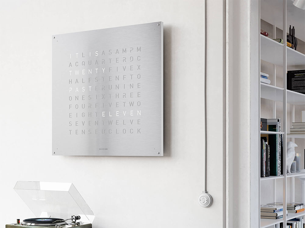 Nástěnné hodiny, které lze umístit i na stojan Qlocktwo Earth 90 Stainless Steel. Exkluzivní, prestižní design, originální nápad na prezentaci aktuální doby, který si zamilujete na první pohled. Už žádné tradiční tipy. Qlocktwo je německý výrobce s úplně jiným pohledem na čas. Qlocktwo zobrazuje čas typograficky v kombinaci se čtyřmi rohovými osvětlenými tečkami symbolizujícími jednotlivé minuty. Slova na číselníku se mění každých 5 minut. Senzory automaticky přizpůsobují světlo vnějším světelným podmínkám, takže můžete snadno odečítat čas v noci nebo když je uvnitř silné sluneční světlo. Jas lze také nastavit ručně.