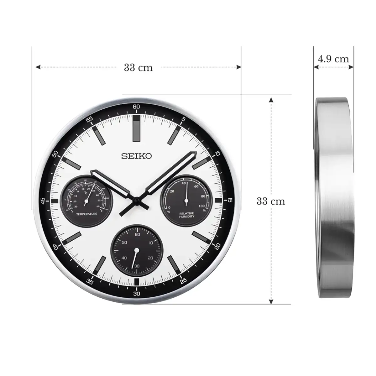 Seiko QXA823S jsou výjimečné nástěnné hodiny, které přenášejí legendární styl chronografů typu panda přímo na stěnu vaší kanceláře, obývacího pokoje nebo pracovny. Pevné hliníkové pouzdro ve stříbrné barvě o průměru 33 cm obklopuje světlý ciferník s kontrastními černými subciferníky, což zařízení dodává profesionální a technický vzhled. Jsou ideální volbou pro milovníky motorismu a klasického designu, kteří hledají předmět spojující přesné měření času s funkcemi sledování okolního prostředí.