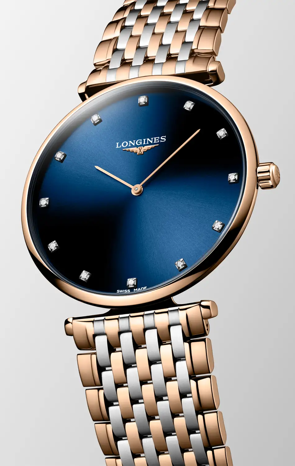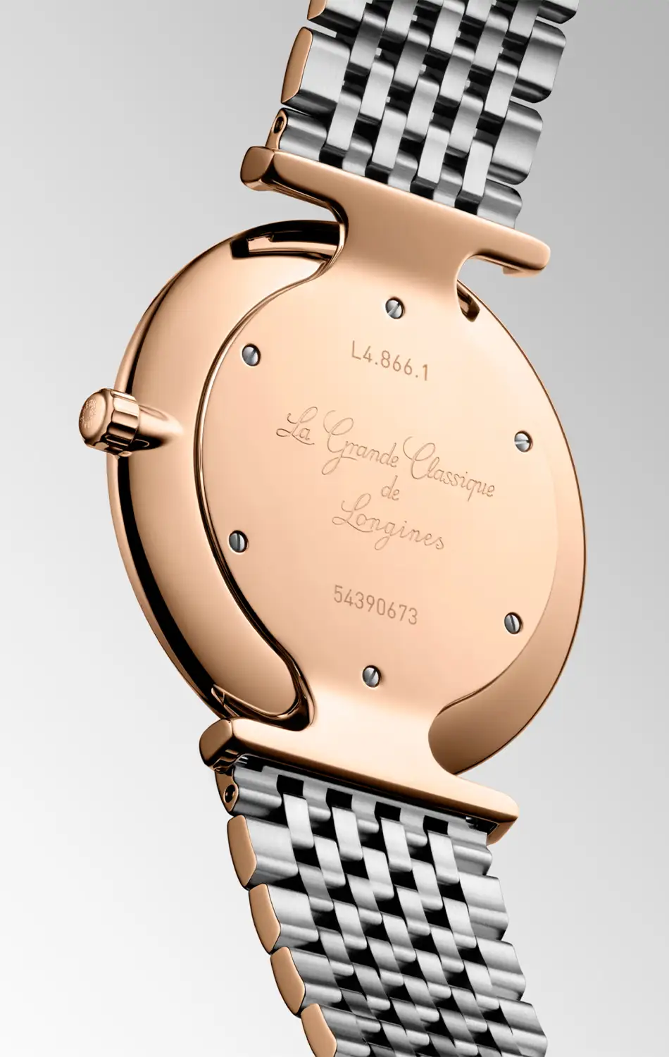 V kompaktním pouzdře o průměru 38 mm je použita odolná ocel 316L s PVD povlakem v barvě růžového zlata, která podtrhuje štíhlou konstrukci modelu. Bicolor náramek se skládá z jemných článků s vysoce lesklou povrchovou úpravou a motýlová spona zajišťuje plynulost linie a pohodlí při nošení. O přesnost chodu se stará quartzový strojek L420 napájený baterií, známý svou spolehlivostí a dlouhou životností.