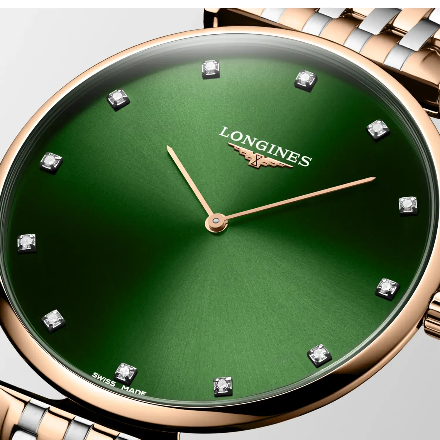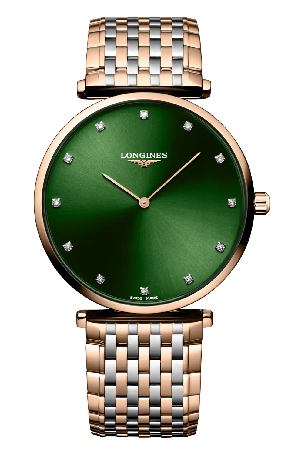 Hodinky s diamanty Longines La Grande Classique L4.866.1.08.7 v dvoubarevném provedení s zeleným ciferníkem jsou pánské кварcové hodinky Longines pro ty, kteří hledají luxus vyjádřený detailem, nikoli okázalostí. Vynikají ultratenkým profilem, elegantním bicolor náramkem a 12 diamanty na ciferníku - jde o model, který nepotřebuje komplikace, aby přitahoval pozornost. Byl vytvořen s ohledem na osoby, které oceňují lehkost formy, nadčasovou třídu a švýcarskou přesnost v každodenním provedení.