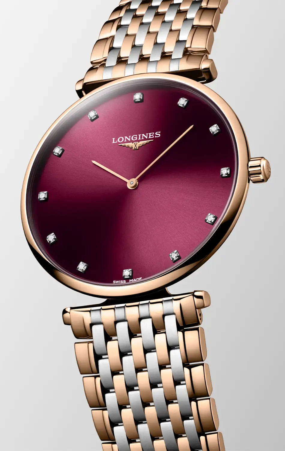 Hodinky s diamanty Longines La Grande Classique L4.866.1.68.7 v dvoubarevném provedení s červeným ciferníkem jsou pánské кварcové hodinky Longines pro ty, kteří hledají luxus vyjádřený detailem, nikoli okázalostí. Vynikají ultratenkým profilem, elegantním bicolor náramkem a 12 diamanty na ciferníku – jde o model, který nepotřebuje komplikace, aby přitahoval pozornost. Byl vytvořen s ohledem na osoby, které oceňují lehkost formy, nadčasovou třídu a švýcarskou přesnost v každodenním provedení.