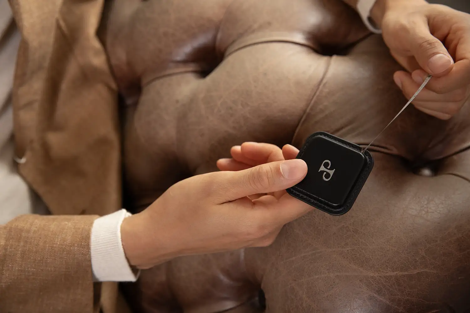 Kryt je vyroben z černé ražené veganské kůže s nubukovým akcentem a elegantní charakter celku podtrhuje stříbrné logo DP. Uvnitř se nachází svinovací ocelové pásmo o délce 150 cm, ideální pro domácí, módní nebo kreativní měření. Vysoká kvalita zpracování a důraz na detail jsou charakteristickými znaky kolekce Philipp.