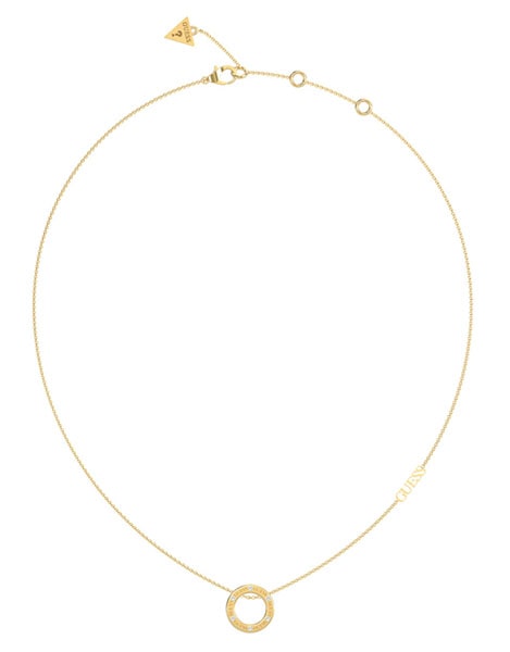Guess Circle Lights je zlatý náhrdelník na jemném řetízku s nápisem GUESS a kulatým přívěskem s gravírovaným logem a zirkony.