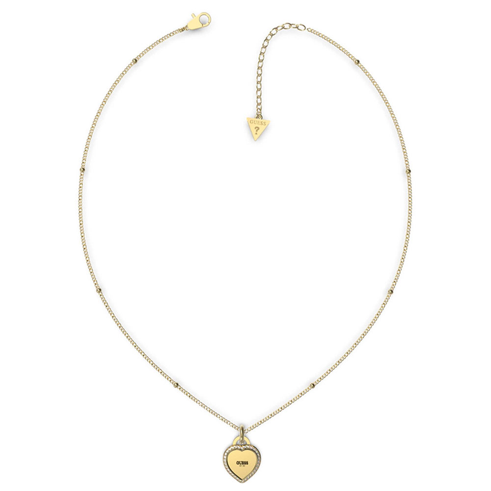 Ocelový náhrdelník zlaté barvy na řetízku s drobnými kuličkami a přívěskem ve tvaru srdce s logem Guess a krystaly Swarovski®. Vytvořeno známou americkou společností GUESS. Tento módní doplněk patří do kolekce Fine Heart a skvěle se hodí na každodenní nošení i na večerní akce. Pozlacený náhrdelník s přívěskem srdce a krystaly Guess byl vytvořen pro moderní ženy, které mají rády elegantní šperky s milostným akcentem.