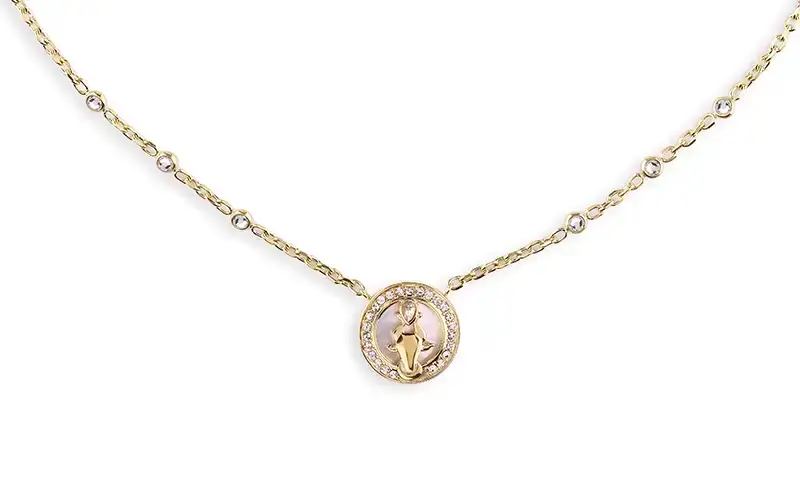 Guess My Sign JUBN04621JWYGT/U je elegantní, pozlacený náhrdelník se znamením zvěrokruhu Býka (Taurus) z kolekce zodiakálních šperků Guess My Sign. Ideální pro ženy, které oceňují symboliku a fascinují je tajemná magie vesmíru. Náhrdelník pro Býka Guess JUBN04621JWYGT/U je vyroben z vysoce kvalitní chirurgické oceli, pokovené žlutým zlatem, a má kulatý přívěsek se znakem zvěrokruhu, zdobený krystalky na okrajích a jedním větším uvnitř. Délka náhrdelníku je 54 cm a pohodlné zapínání na karabinku s možností nastavení zajišťuje komfort při nošení.