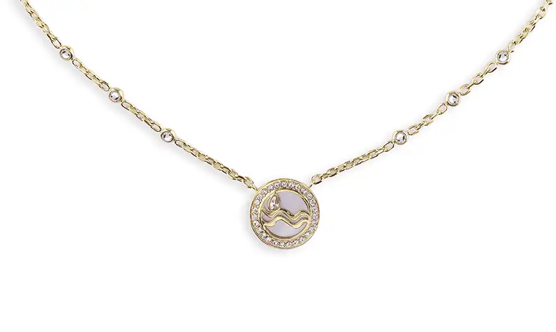 Guess My Sign JUBN04639JWYGT/U je elegantní, pozlacený náhrdelník se znamením zvěrokruhu Vodnáře (Aquarius) z kolekce zodiakální bižuterie Guess My Sign. Ideální pro ženy, které oceňují symboliku a fascinují je tajemná magie vesmíru. Náhrdelník pro Vodnáře Guess JUBN04639JWYGT/U je vyroben z vysoce kvalitní chirurgické oceli, pozlacené žlutým zlatem, a má kulatý přívěsek se symbolem zvěrokruhu, ozdobený krystaly na okrajích a jedním větším uvnitř. Délka náhrdelníku je 54 cm a pohodlné zapínání na karabinku s možností regulace zajišťuje komfort nošení.
