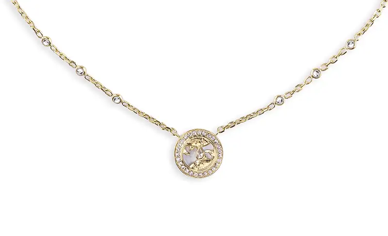 Guess My Sign JUBN04641JWYGT/U je elegantní, pozlacený náhrdelník se znamením zvěrokruhu Ryby (Pisces) z kolekce zodiakální bižuterie Guess My Sign. Ideální pro ženy, které si cení symboliky a fascinuje je tajemná magie vesmíru. Náhrdelník pro Ryby Guess JUBN04641JWYGT/U je vyroben z vysoce kvalitní chirurgické oceli, pokovené žlutým zlatem, a má kulatý přívěsek se symbolem zvěrokruhu, ozdobený krystalky na okrajích a jedním větším uvnitř. Délka náhrdelníku je 54 cm a pohodlné zapínání na karabinku s možností regulace zajišťuje komfortní nošení.