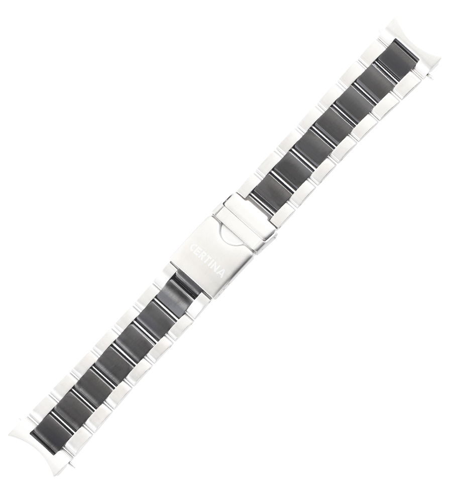 Originální náramek C605017698 pro pánské hodinky Certina DS Podium Chronograph GMT. Vyrobeno z nerezové oceli s černým PVD sportovním pruhem, který se táhne uprostřed. Zatahovací články zaručují padnutí na každé pánské zápěstí. Náramek je určen pouze pro modely se servisním číslem C001639 , které se nachází na zadní straně pouzdra ze spodní části hodinek.