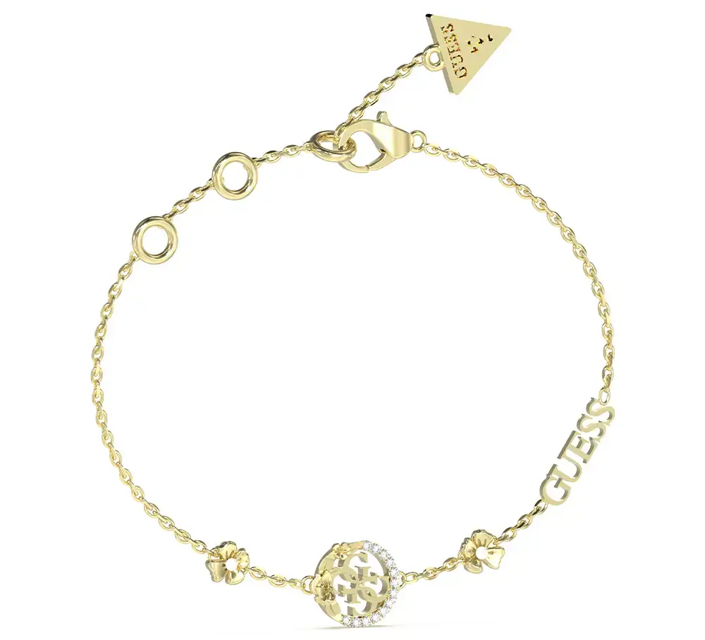 Pozlacený náramek z chirurgické oceli s logem 4G, zirkony a květinami Guess 4 Love JUBB05039JWYGS je design, který nově interpretuje klasickou logomanii prostřednictvím lehčích, organických akcentů, díky čemuž se tento model stává ideálním šperkem na jaro a léto.