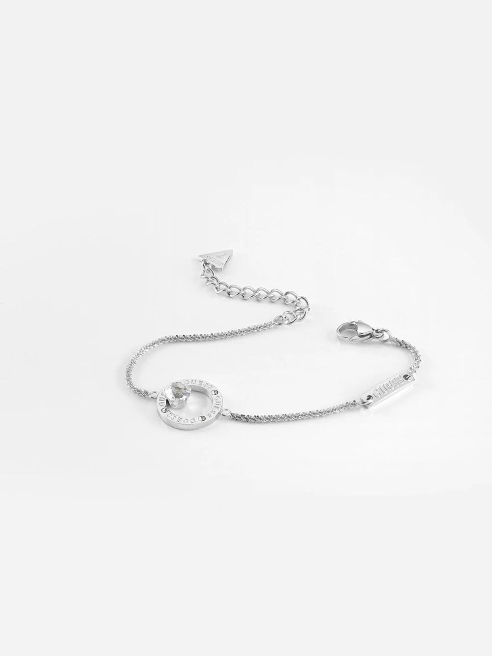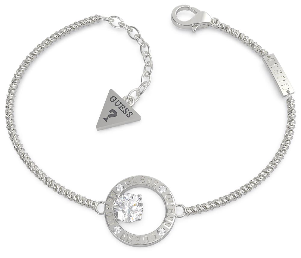 Celá podstata tohoto šperku se skládá z jemného řetízku a dalšího v podobě nastavitelné spony, plakety s obráceným trojúhelníkem Guess a otazníkem a také elegantního kulatého přívěsku s průhledným krystalem uvnitř. Jedná se o vynikající nabídku pro ženy, které mají rády jemné a zvláště ženské šperky, které se budou hodit pro každou příležitost.