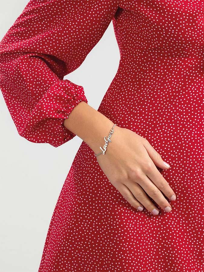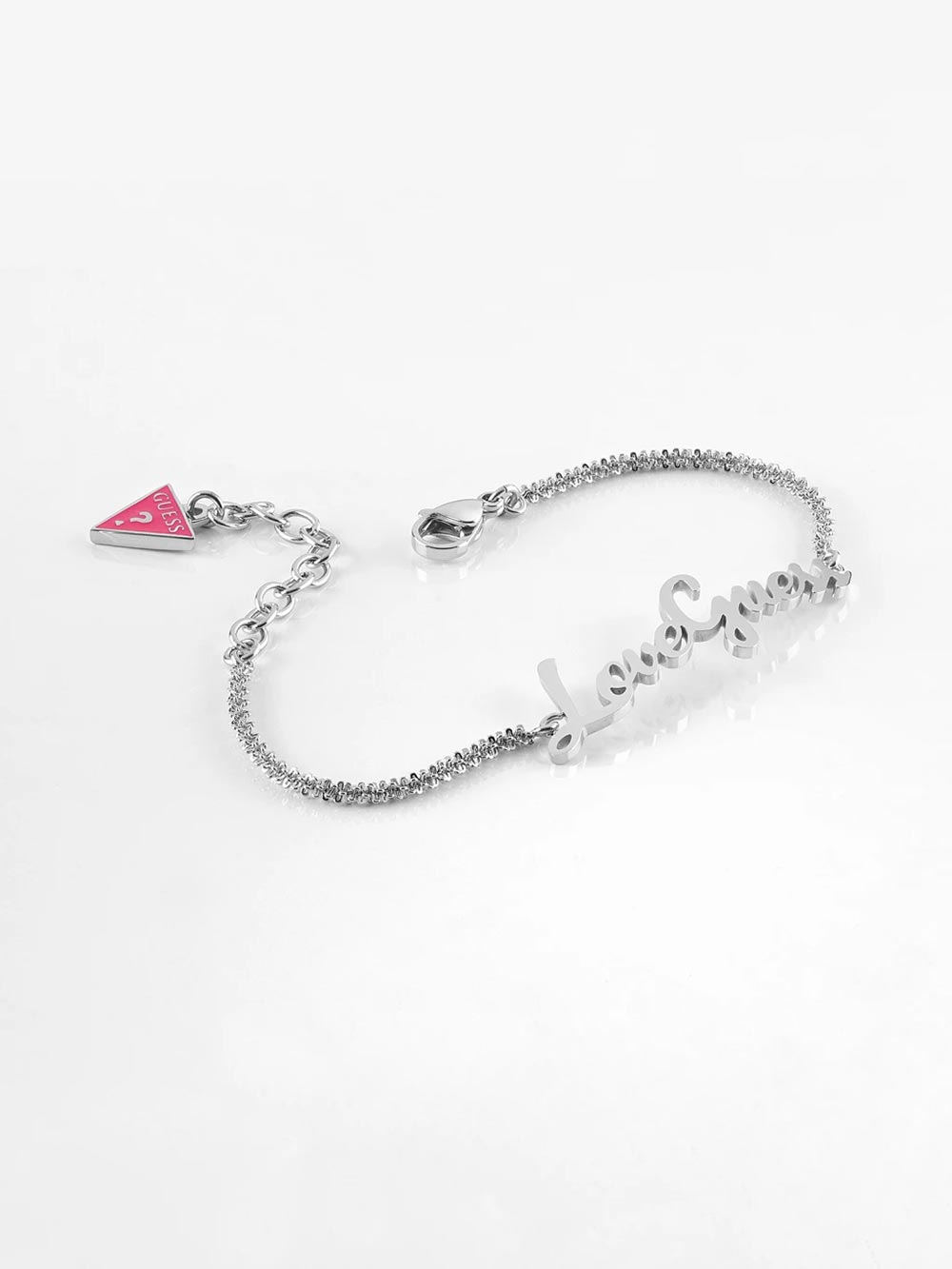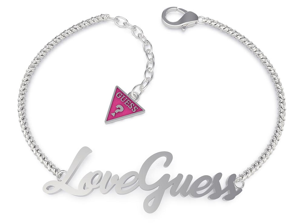 Stříbrný náramek na řetízku s nápisem "Love Guess". Pochází od známé americké firmy Guess z kolekce Dream & Love. Módní, stylové, elegantní a s extravagantním růžovým akcentem. Byl vytvořen pro moderní ženy, které mají rády šperky s jedinečným charakterem.