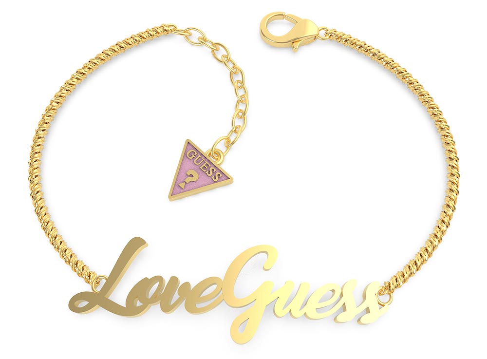 Žluto-zlatý náramek na řetízku s nápisem "Love Guess". Pochází od známé americké firmy Guess z kolekce Dream & Love. Módní, stylové, elegantní a s jemným růžovým akcentem. Byl vytvořen pro moderní ženy, které mají rády šperky s jedinečným charakterem.