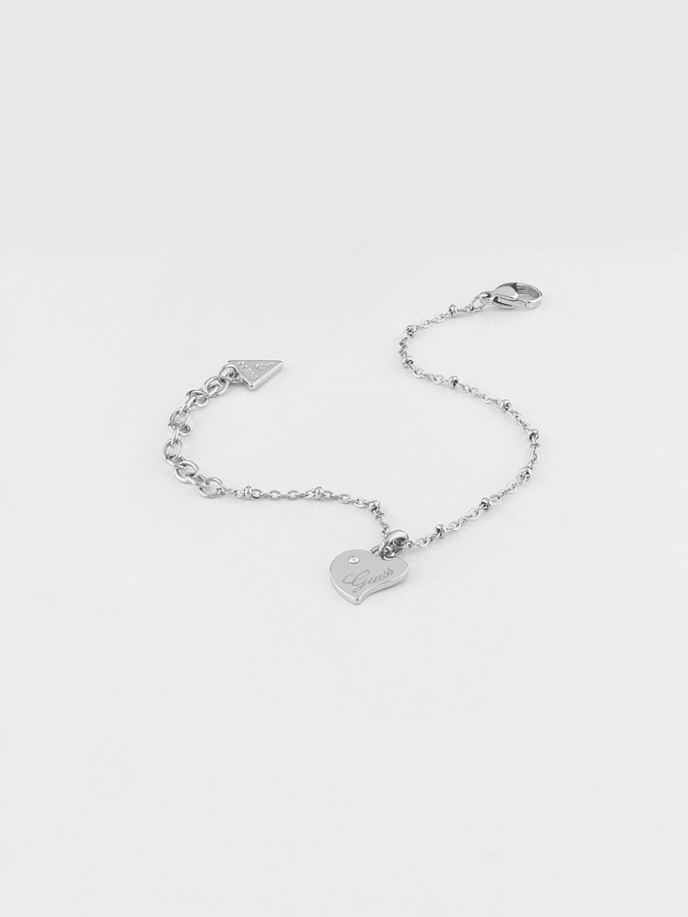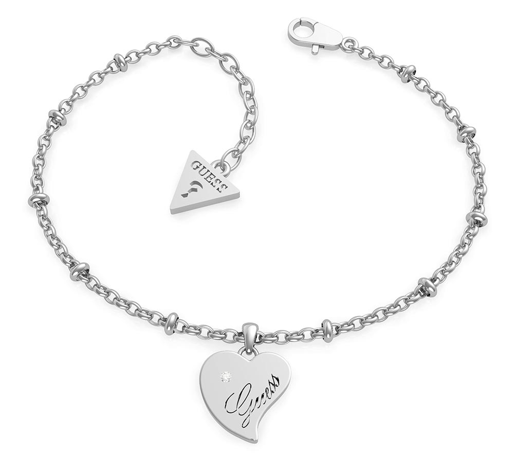 Náramek na řetízku s malými kroužky ve stříbrné barvě, s jedinečným přívěskem srdce a krystalem Swarovski®. Pochází od známé americké firmy Guess z kolekce Queen Of Heart. Byl vytvořen pro moderní a elegantní ženu, která se ráda obklopuje krásou plnou jemnosti a láskyplné nálady.