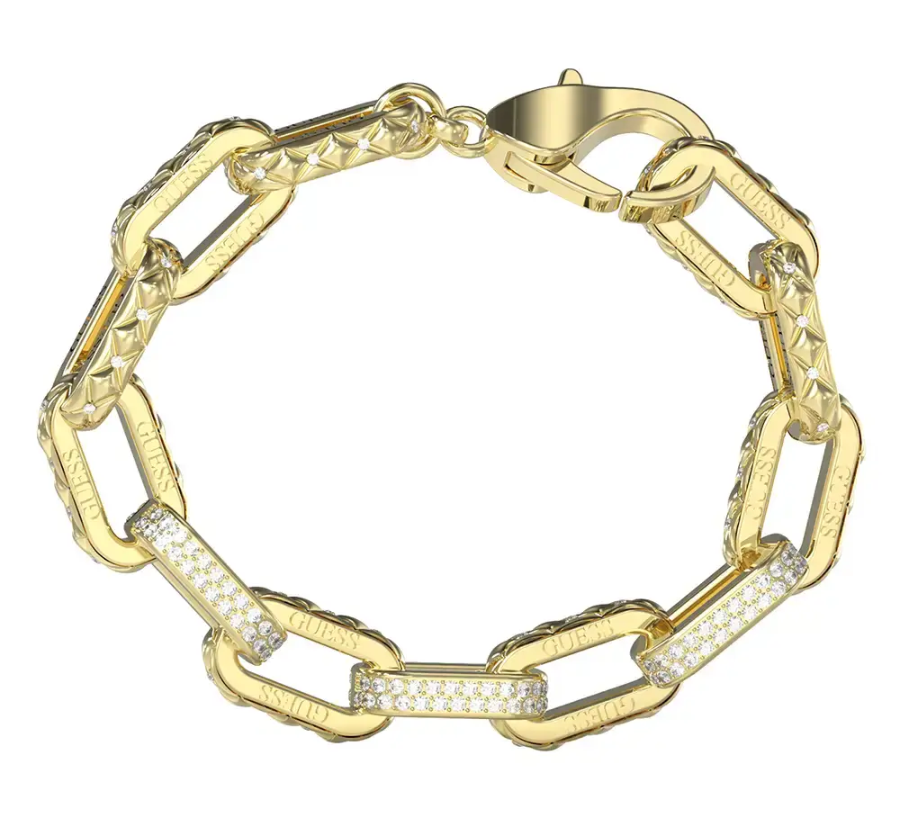 Pozlacený dámský náramek řetěz Guess Stylish JUBB04579JWYGS s pohodlným zapínáním na karabinku je výjimečný doplněk, který zaujme výrazným designem. Vyroben z odolné chirurgické oceli pokovené žlutým zlatem, vyniká mimořádnou pevností a elegancí. Jeho charakteristická velká logovaná oka v kotvovém stylu jsou efektně ozdobena krystaly ve stylu Matelassé, což dodává náramku lesk a exkluzivní vzhled. Zlatý náramek z ušlechtilé oceli z kolekce Stylish Guess je extravagantní a luxusní ozdobou pro odvážné ženy, které si cení výrazných doplňků podtrhujících jejich sebevědomou a dominantní osobnost.