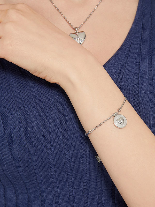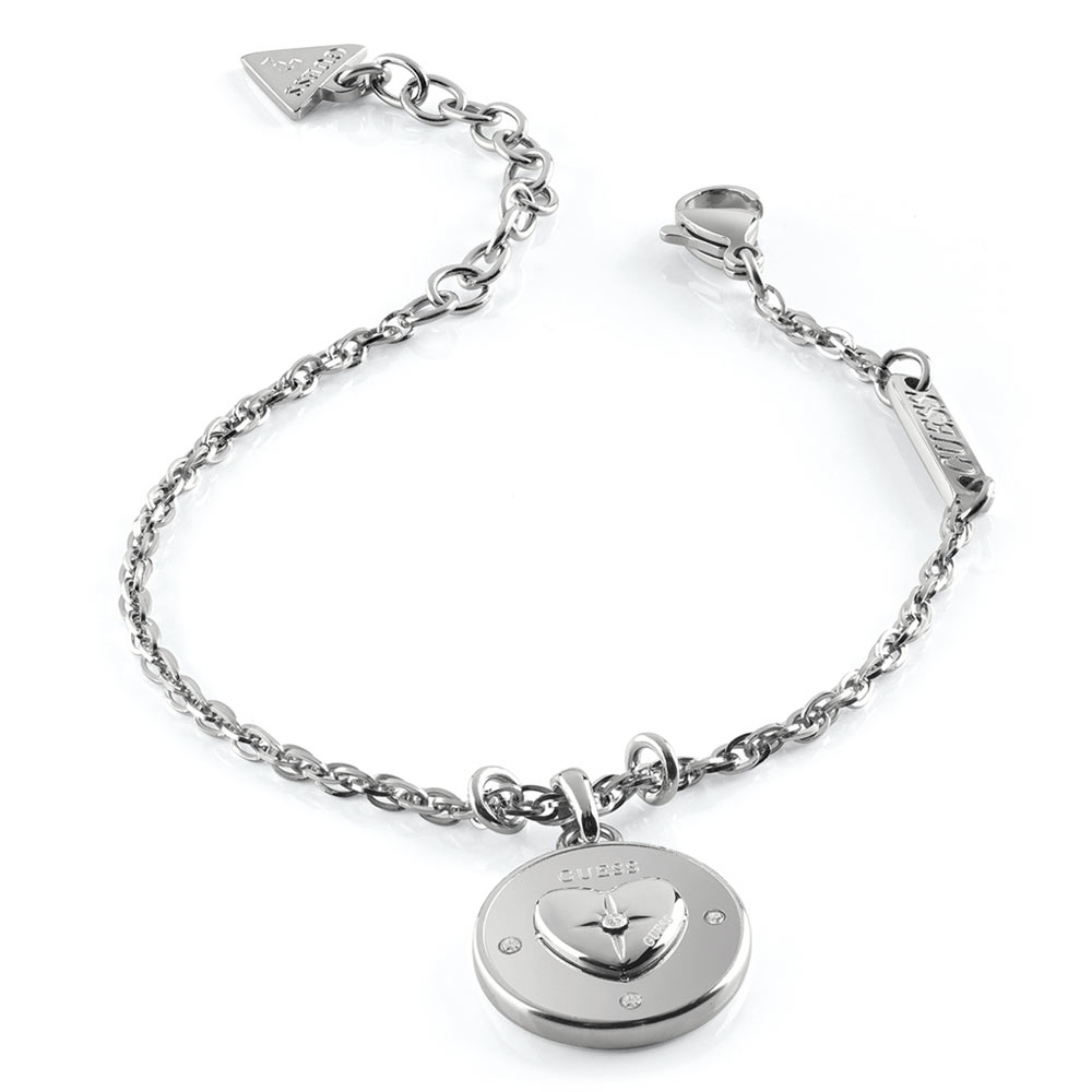 Ocelový náramek na řetízku stříbrné barvy s logem Guess a přívěskem ve tvaru mince s vyvýšeným srdcem s logem a krystaly Swarovski®. Vytvořeno známou americkou společností GUESS. Tento módní doplněk patří do kolekce Talismania a skvěle se hodí na každodenní nošení i na večerní párty. Stříbrný náramek s přívěskem srdce a krystaly Guess byl vytvořen pro moderní ženy, které mají rády elegantní šperky s milostným akcentem.