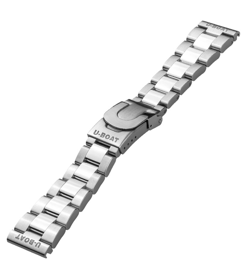Originální 22 mm široký náramek pro hodinky U-Boat. Vyrobeno z vysoce kvalitní nerezové oceli 316L. Články náramku se vyznačují leštěnou úpravou uprostřed a matnou úpravou po stranách. Články jsou navíc spojeny šrouby, které zajišťují pevné spojení. Díky hladké povrchové úpravě náramek dokonale padne na zápěstí a zajišťuje pohodlí při nošení. Zapínání je opatřeno snadno ovladatelným mikronastavením, umožňujícím přesné nastavení délky náramku. Detaily ve tvaru U nejen dodávají estetiku, ale také usnadňují použití spony. Logo bylo navíc přesně vyřezáno laserem na dvou konečných a dvou počátečních článcích, což náramku dodává individuální charakter a eleganci.