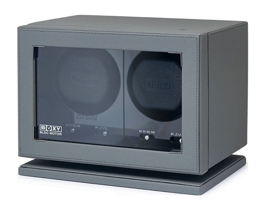 Exkluzivní rotomat Beco Boxy BLDC-B02 310002 pro natahování 2 automatických hodinek. Elegantní šedý plášť vyrobený ze dřeva zaujme svou koženou úpravou. Interiér je čalouněn černým sametem, který dodává luxus a sofistikovanost. Skleněný kryt navíc chrání hodinky před prachem a nečistotami. Rotomat Boxy 310002 má integrované LED osvětlení, které se rozsvítí po lehkém dotyku krytu a automaticky se vypne po 20 sekundách nečinnosti. Hodiny otáčející se ve dvou směrech vypadají mimořádně efektně, což je módní a zajímavá interiérová dekorace každého interiéru. Největší výhodou je použití bezkomutátorových motorů BLDC-B02, které roztáčí hodinky. Zajišťují velmi hladký chod, jsou obzvláště přesné a spolehlivé a neuvěřitelně tiché.