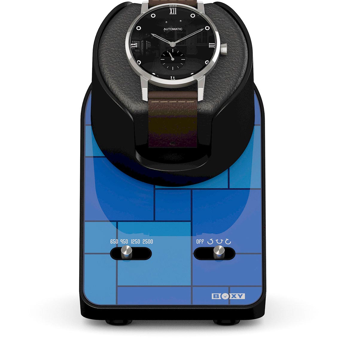 Natahovací zařízení hodinek Rotomat Beco Boxy BLDC Nightstand Graphic Blue 309135 s automatickým strojkem. Moderní tvar a kompaktní rozměry umožňují umístit ji například na noční stolek nebo jiný kus nábytku. Snadno se používá, má dva přepínače: první pro počet otáček a druhý pro směr otáčení.