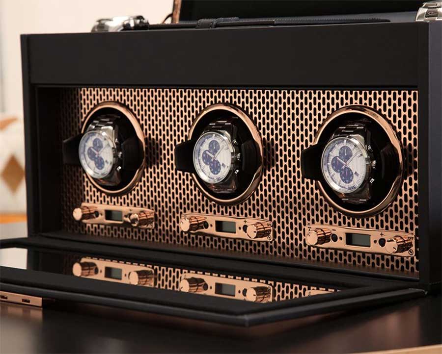 Výkonný, elegantní a sofistikovaný natahovač WOLF Axis 469416 pro natahování tří hodinek. Mají krásný měděný povrch, měkký semišový vnitřek hodinek a skleněné víko. V horní části je přihrádka se zvýšenými bočnicemi na 2 velké hodinky (až 52 mm), 4 menší přihrádky a cestovní pouzdro. Celek působí efektně a elegantně, natahovací zařízení hodinek jistě dodá exkluzivitu každému interiéru.